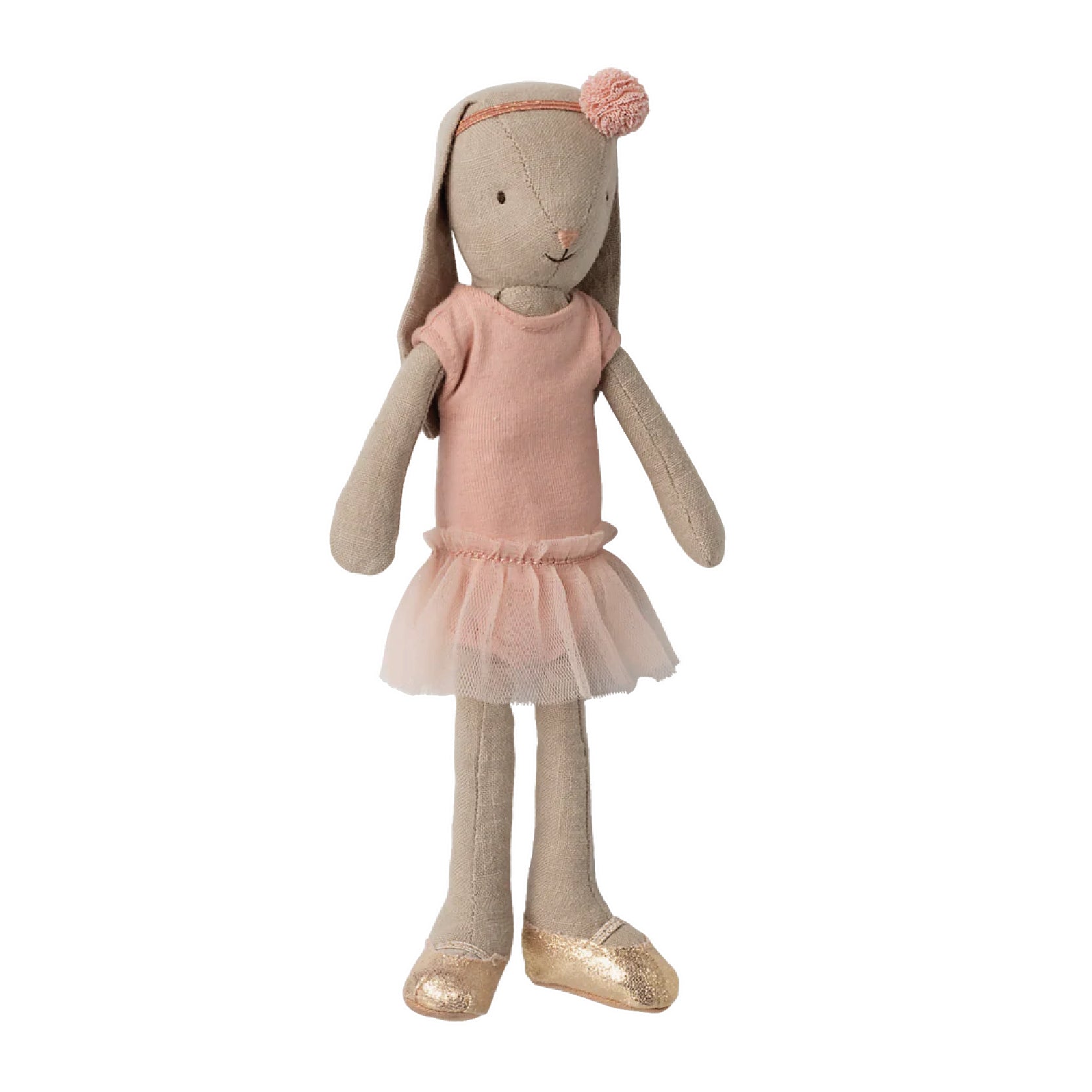 A clássica coelhinha da Maileg está pronta para a sua aula de ballet com o seu lindo conjunto cor-de-rosa, saia de tule e sapatilhas de ballet.