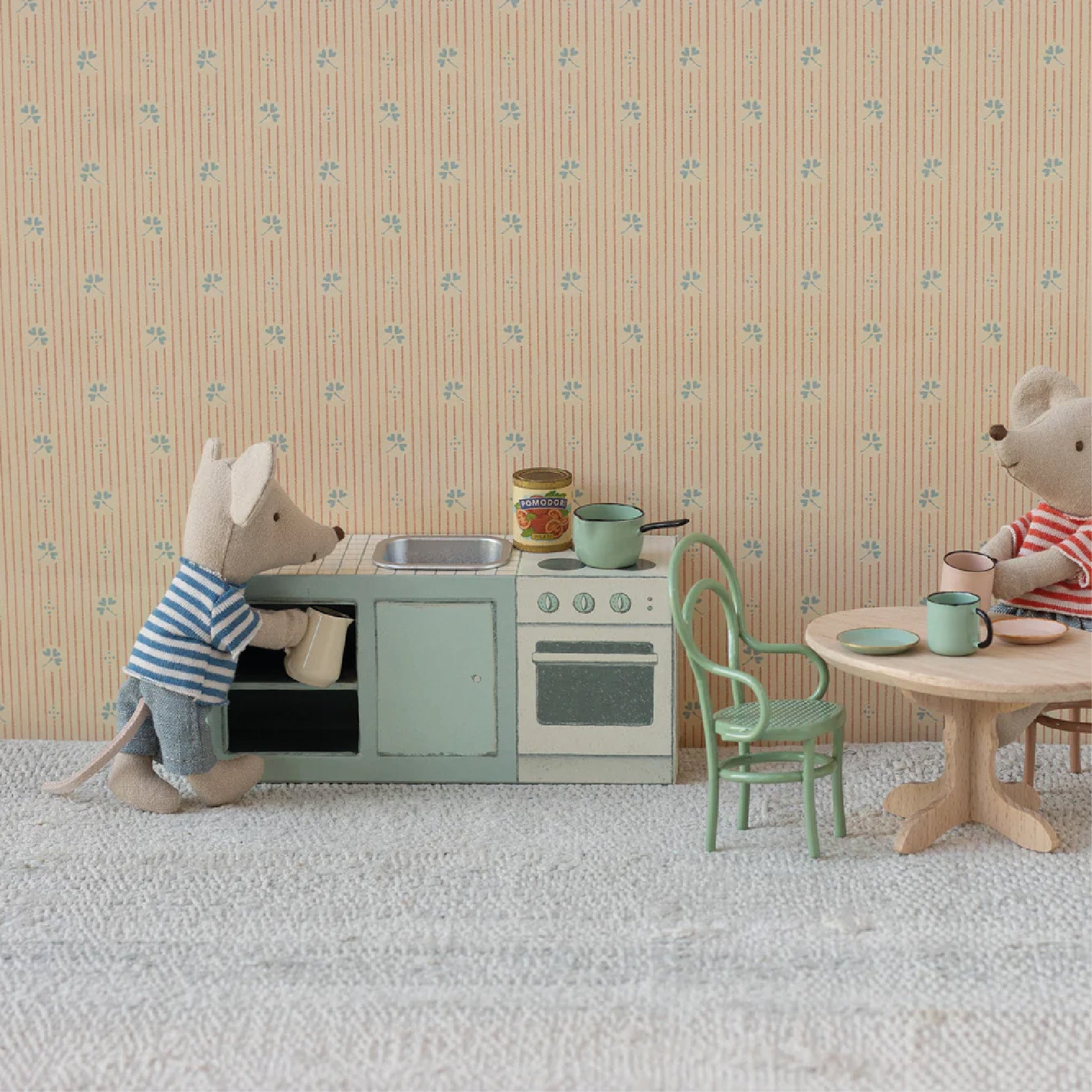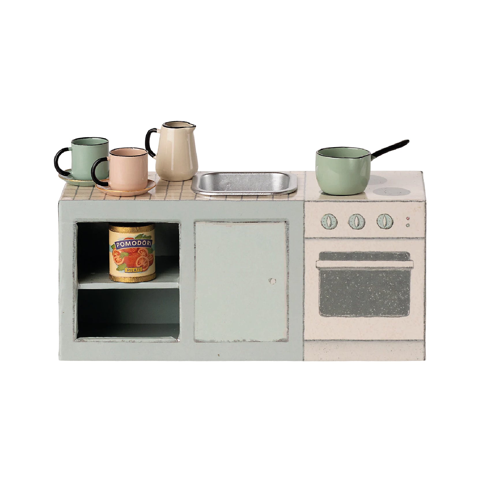 A divertida caixa da cozinha de brincar abre-se para revelar tudo o que precisa para preparar o jantar imaginário perfeito. Inclui duas chávenas e dois pires, uma panela, um jarro e uma lata. A pia em miniatura é feita de metal para parecer o mais realista possível. Encaixa perfeitamente na cozinha da casinha do ratinho SuitCasa.