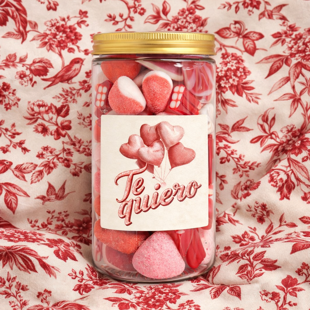 Receberá um espetacular pote de plástico grosso e brilhante de 1 litro com um autocolante e uma tampa de alumínio, cheio de nuvens, corações e beijos em tons de vermelho e rosa, e com um grande autocolante quadrado no centro com o tema do Dia dos Namorados.