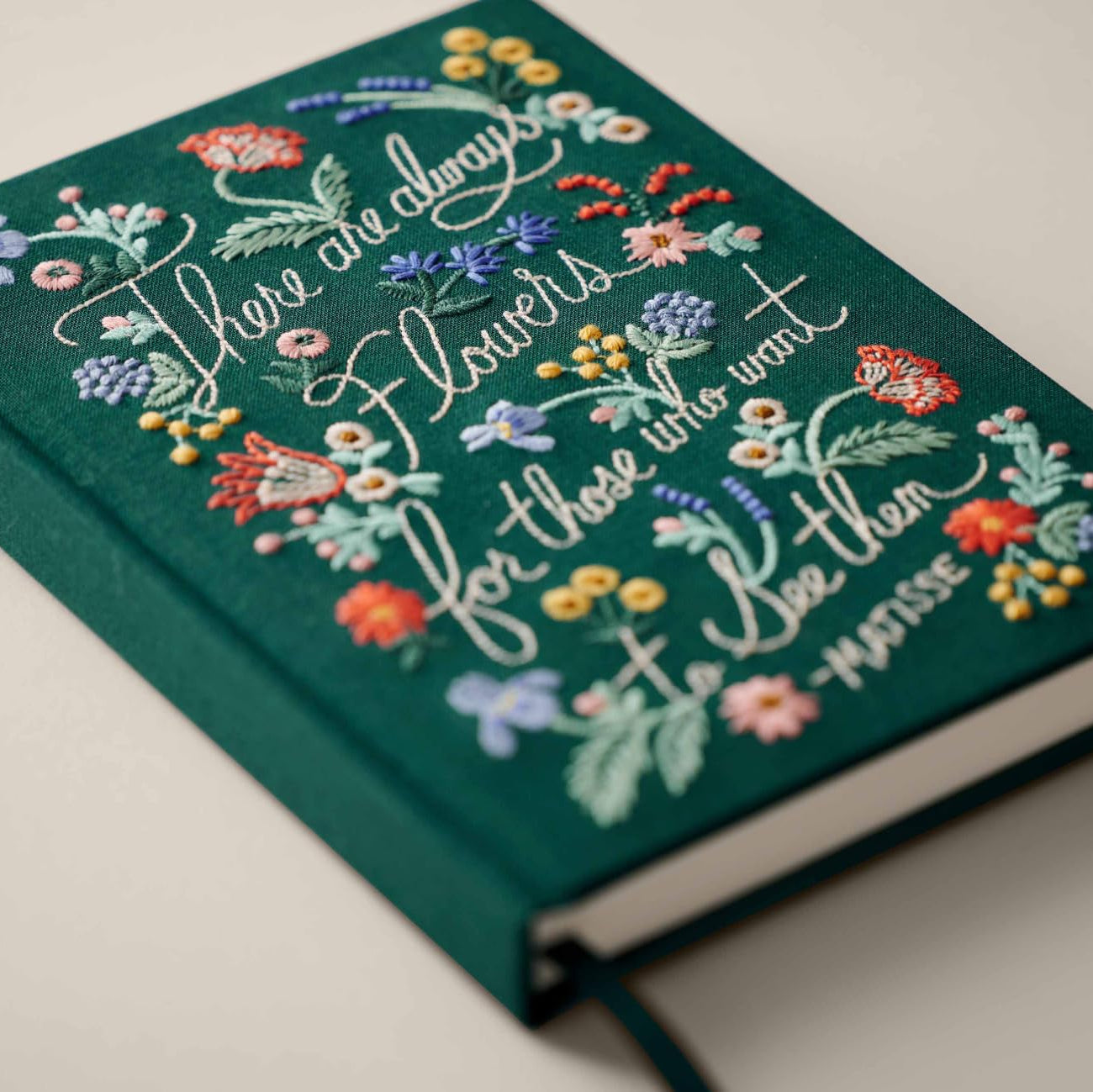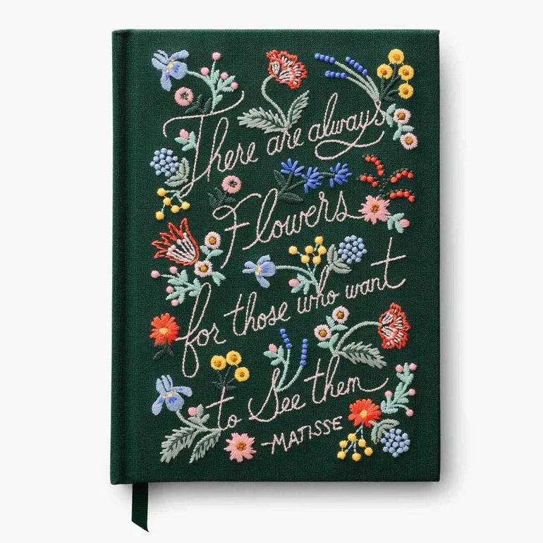 Libreta forrada en tela en color azul marino con frase y flores a juego bordado en la cubierta.