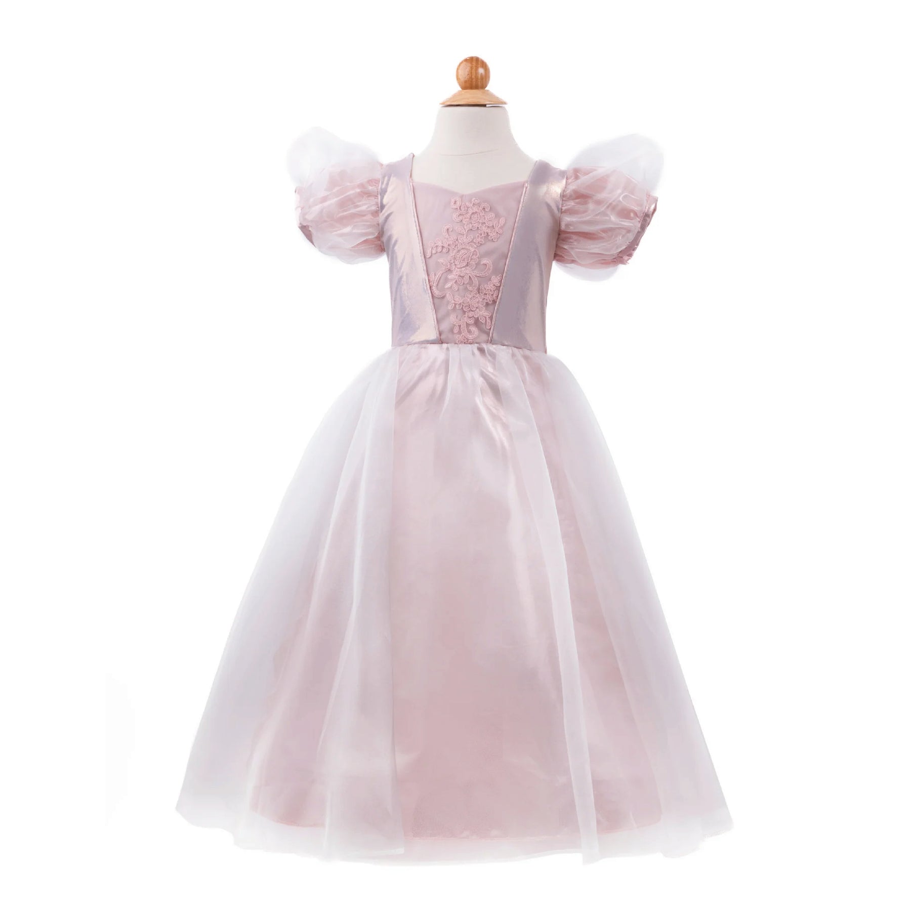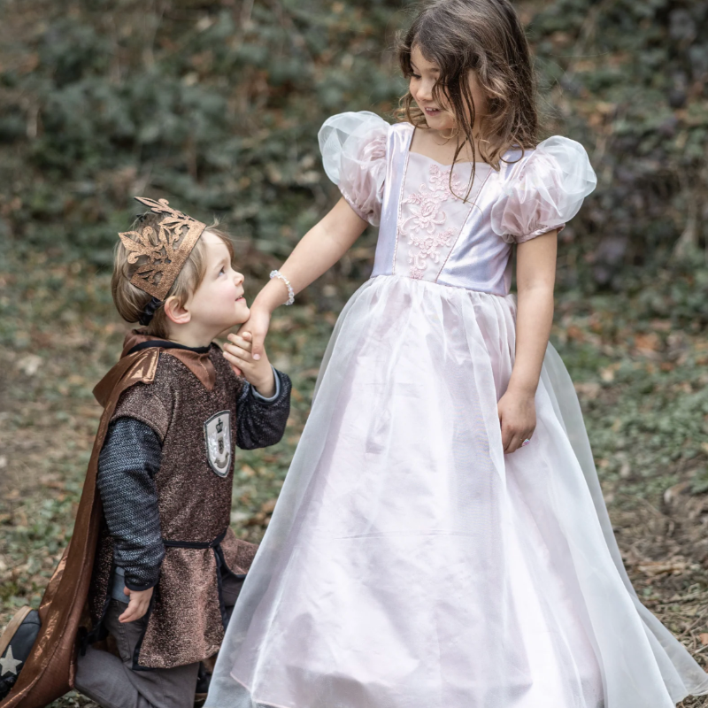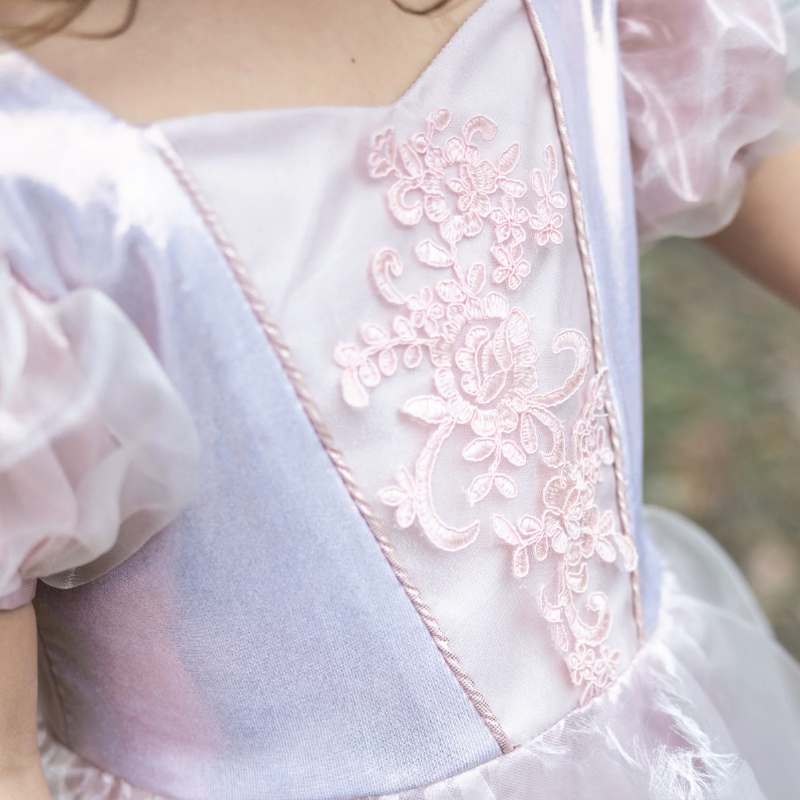Disfraz de princesa en color rosa empolvado de un suave tafetán con acabado en dorado y broche en el centro del pecho. Con detalle de mangas y cintura abullonadas con mucho vuelto para sentirse toda una princesa.