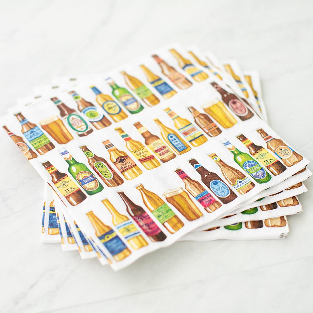 Estes divertidos guardanapos são decorados com um padrão colorido de garrafas e copos de todos os formatos e tamanhos, acrescentando um toque lúdico e descontraído. A variedade de designs evoca a diversidade de garrafas, desde as clássicas às artesanais. O fundo branco faz com que as cores vibrantes dos rótulos se destaquem, criando um contraste fresco e apelativo. Perfeitos para dar um toque de humor e estilo a qualquer evento.