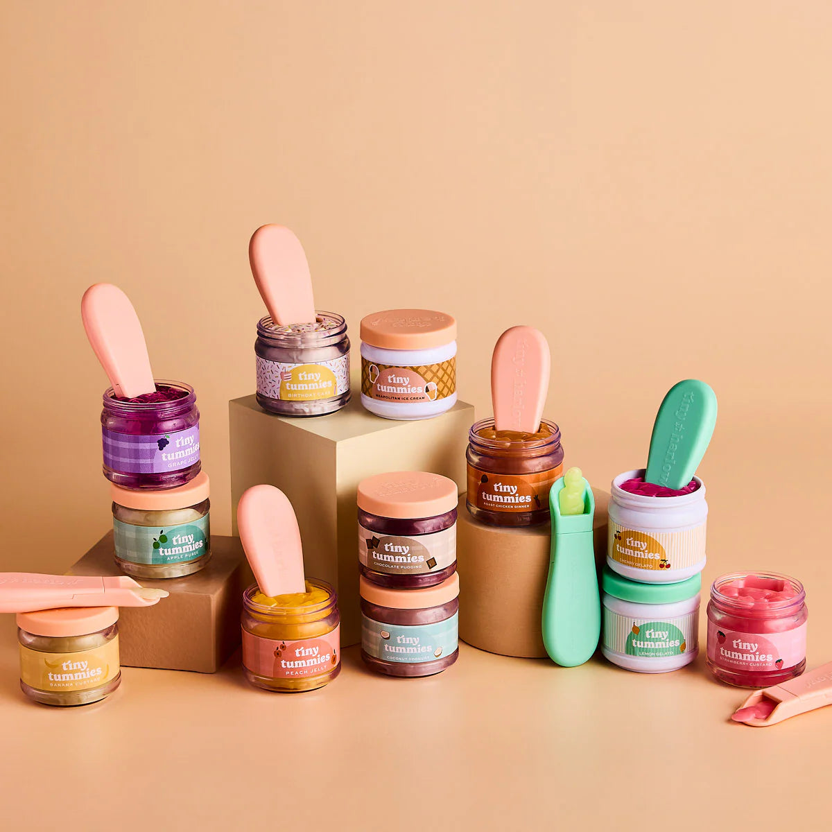 Este set se presenta en un bonito packaging individual y forma parte de la colección Tiny Tummies, disponible en distintos sabores: Coconut Yoghurt, Grape Jelly, Roast Chicken Dinner, Apple Purée, Banana Custard, Chocolate Custard, Strawberry Custard y Peach Jelly.