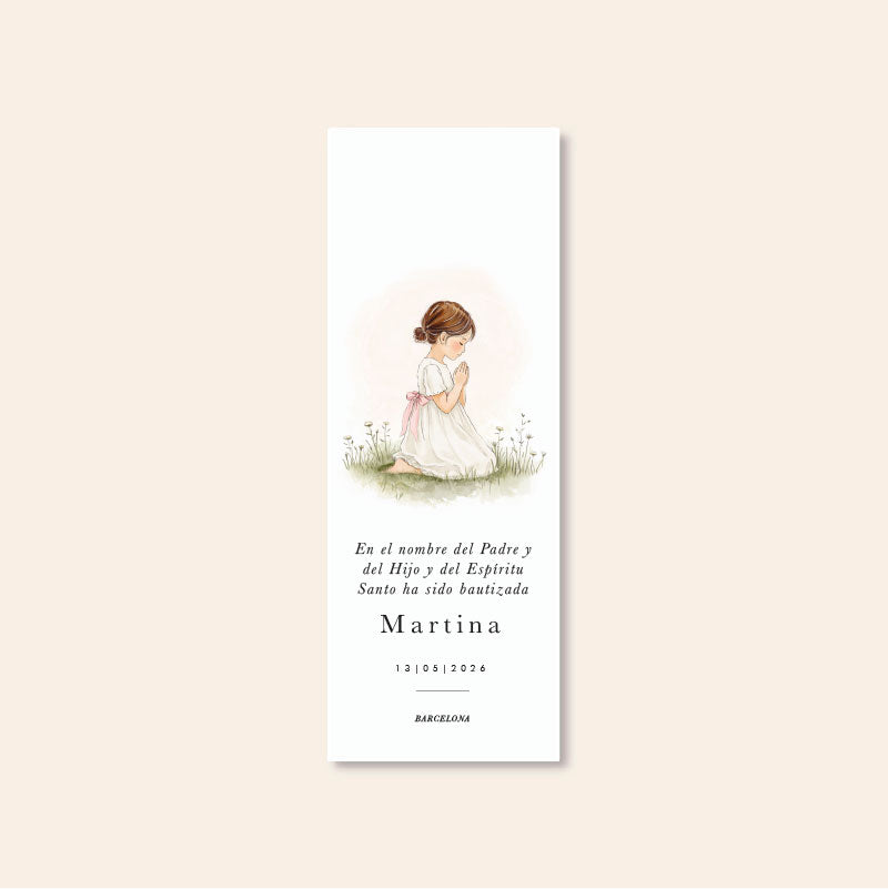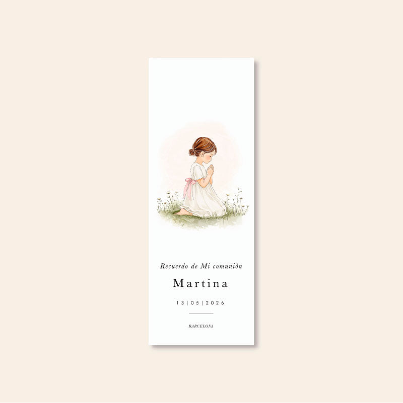 Marcador de livro personalizado para a Primeira Comunhão de uma menina, com uma oração e uma fita cor-de-rosa.