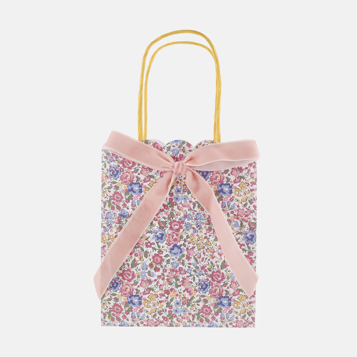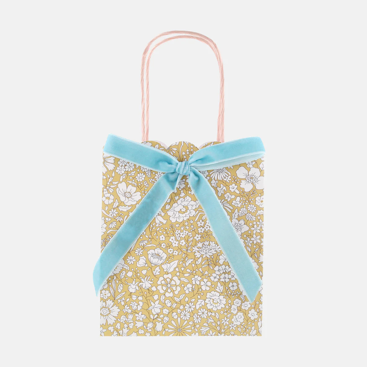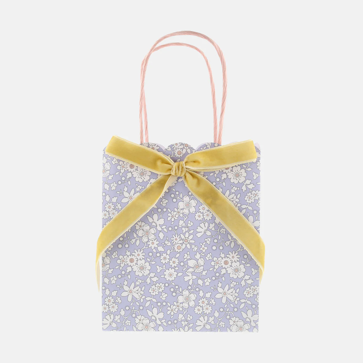 ¡Dale un toque encantador a tu próxima fiesta con nuestras bolsas de Papel! Este conjunto de 8 bolsas es perfecto para sorprender a tus invitados con un detalle especial. Cada una diseñada con un estampado Liberty London diferente y un gran lazo de terciopelo.