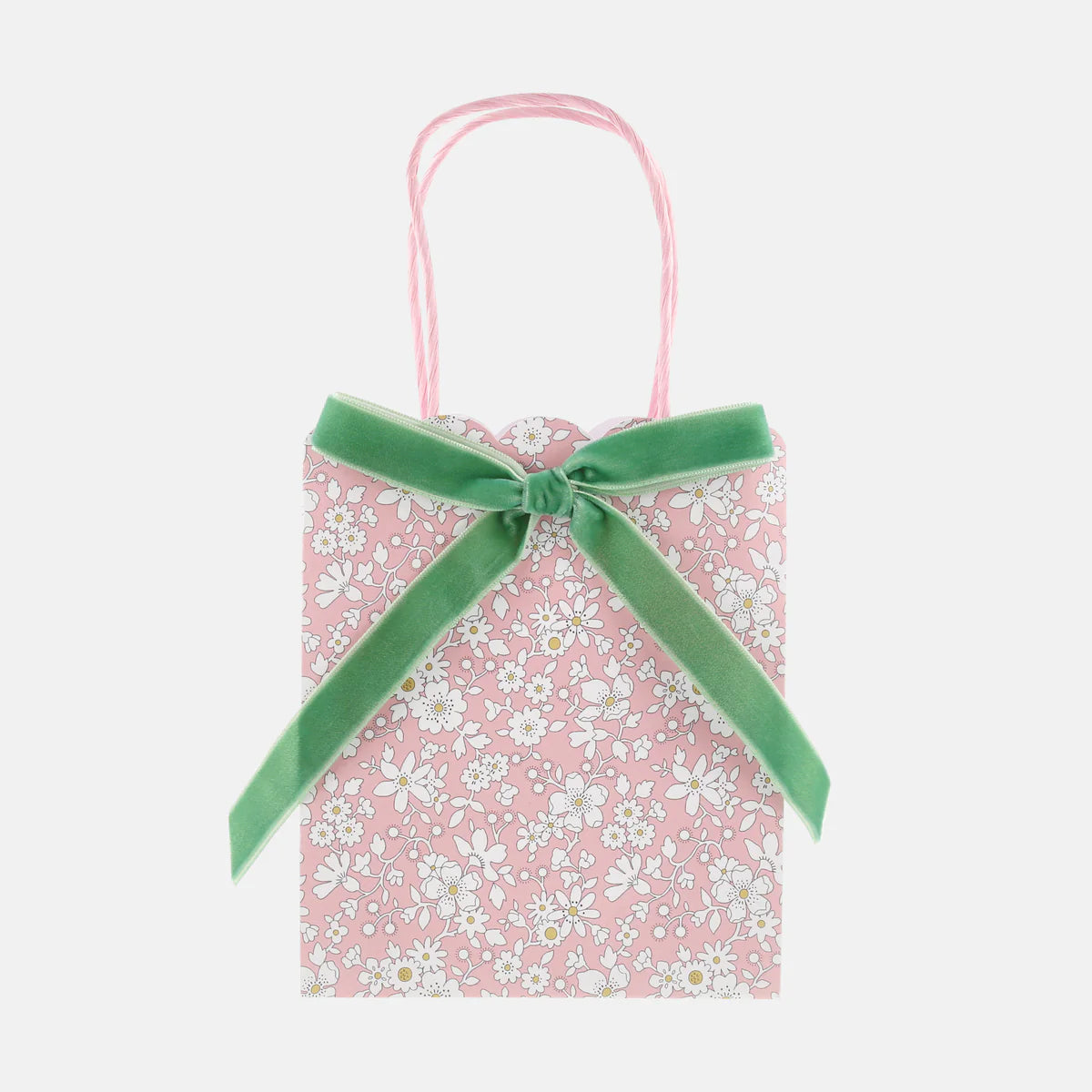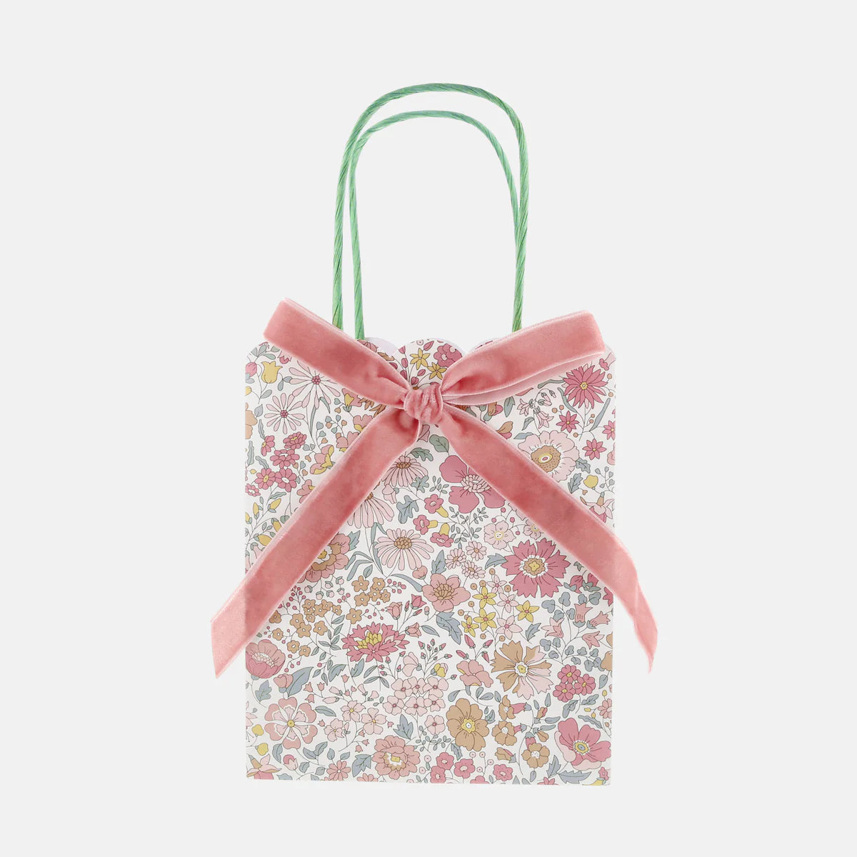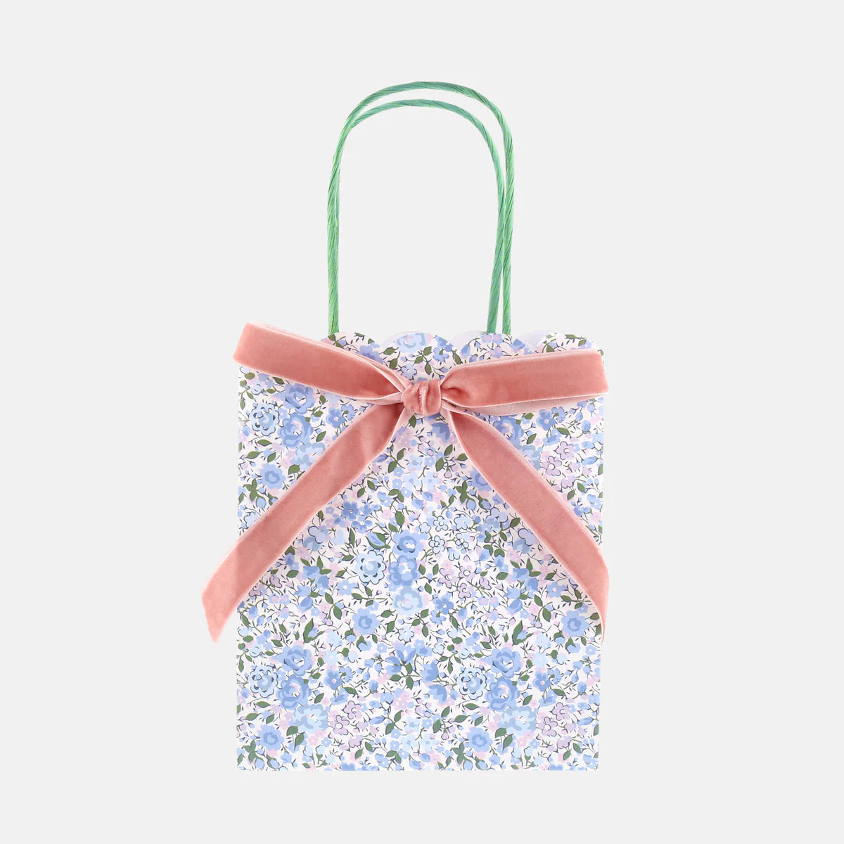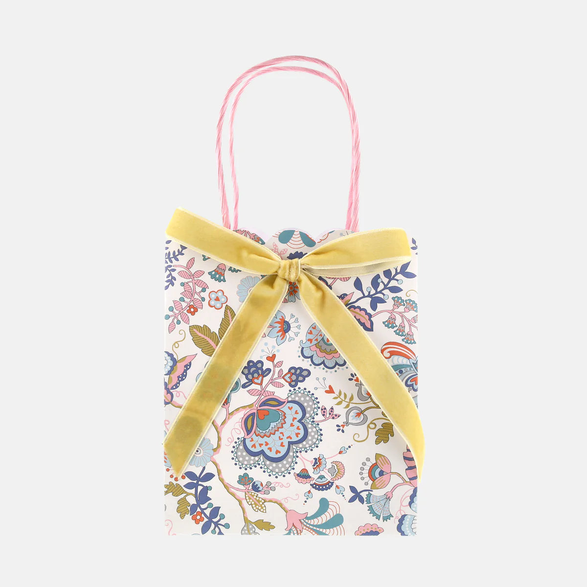 ¡Dale un toque encantador a tu próxima fiesta con nuestras bolsas de Papel! Este conjunto de 8 bolsas es perfecto para sorprender a tus invitados con un detalle especial. Cada una diseñada con un estampado Liberty London diferente y un gran lazo de terciopelo.