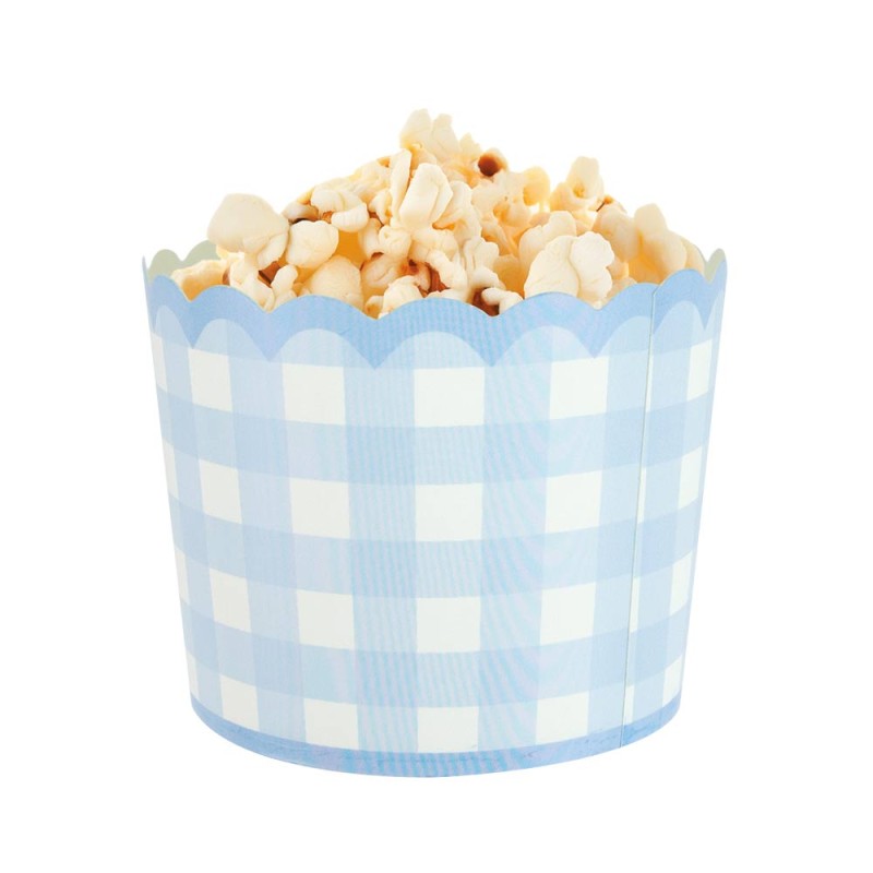 Bases de cartón con estampado vichy celeste y un elegante borde dorado festonado. Perfecto para colocar cupcakes, golosinas o palomitas.