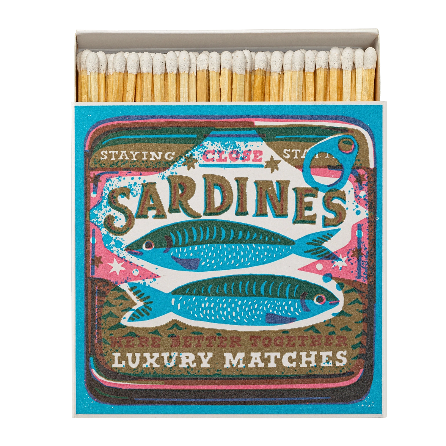 Our iconic square matchbox with a tin design showing two sardines in shades of pink and blue, accompanied by the words “Sardines, We're Better Together, Luxury Matches” .