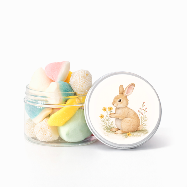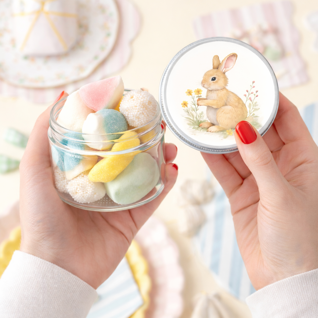 They are ideal for placing at any place on the table or hiding around the garden. Each thick plastic jar has an aluminium lid and a label with a nest of eggs with the text "Happy Easter"