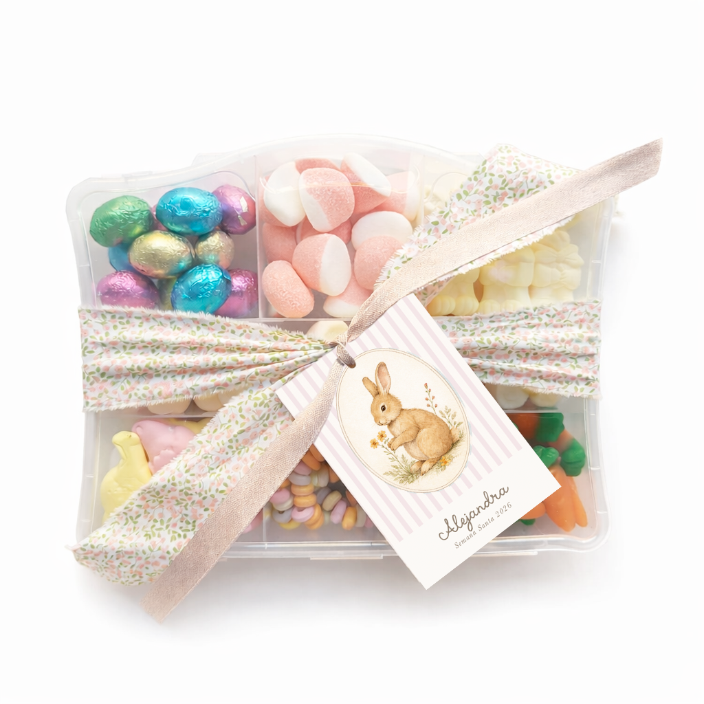 Regala una espectacular maleta repleta de golosinas y chocolates de pascua cuidadosamente elegidos buenísimos de la mejor calidad fabricadas en España. Esta maleta está decorada con cinta, una borla de algodón, con una tarjeta personalizada con inicial que tu elijas y las siglas Semana Santa 2026.