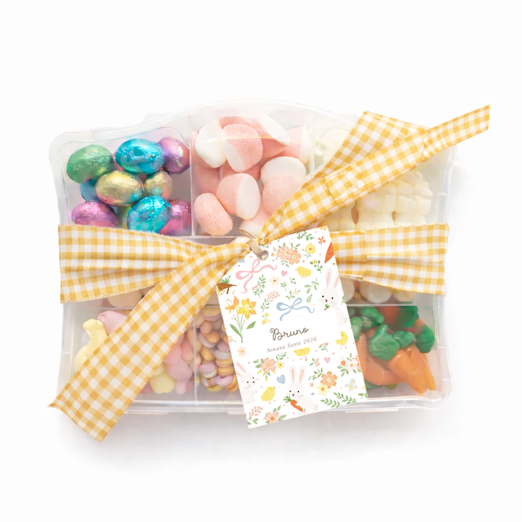 Regala una espectacular maleta repleta de golosinas y chocolates de pascua cuidadosamente elegidos buenísimos de la mejor calidad fabricadas en España. Esta maleta está decorada con cinta, una borla de algodón, con una tarjeta personalizada con inicial que tu elijas y las siglas Semana Santa 2026.