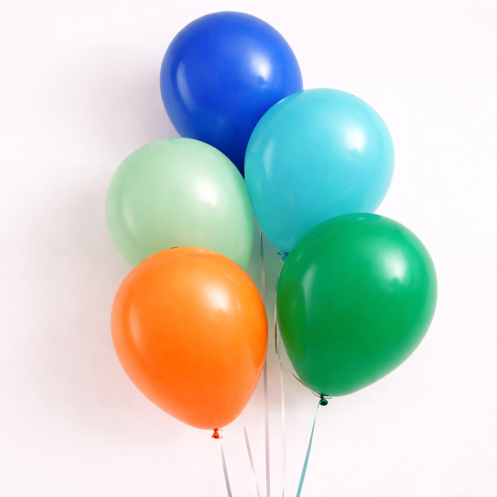 10 pcs. Blue, green and orange latex balloons .