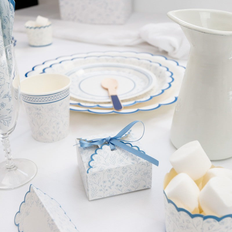 These little boxes with a blue floral print are perfect for holding chocolates or a small gift for your party guests. They close with a delicate blue ribbon.