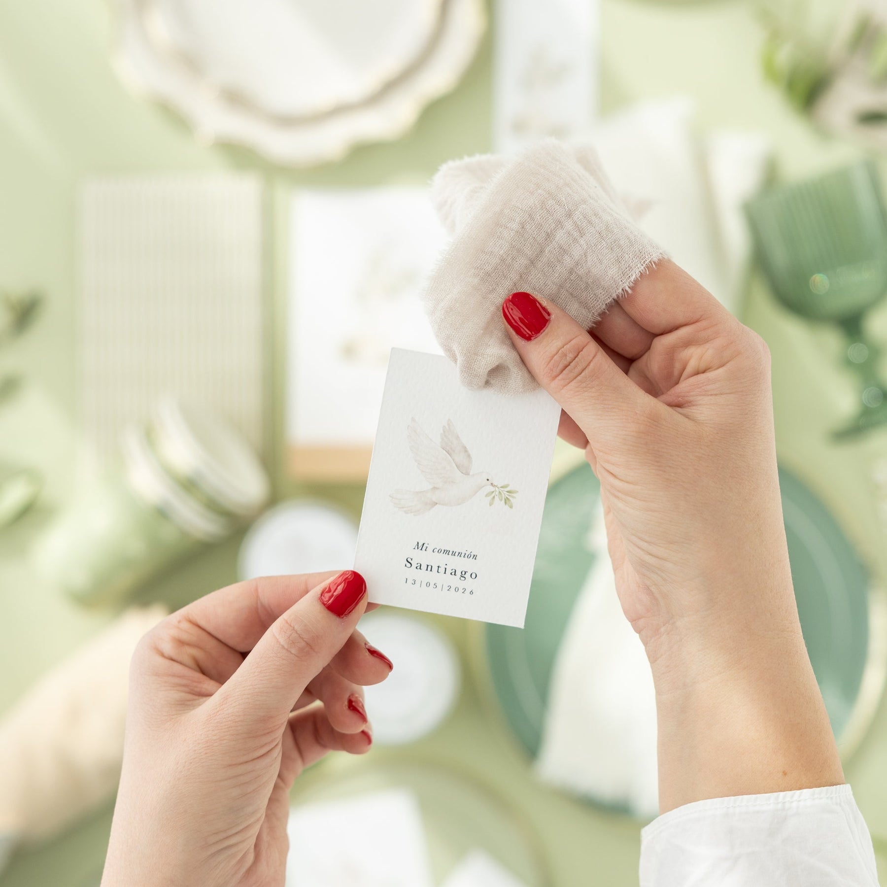 Todos os porta-guardanapos vêm com um tecido colorido à escolha e um cartão com o nome, evento e data.