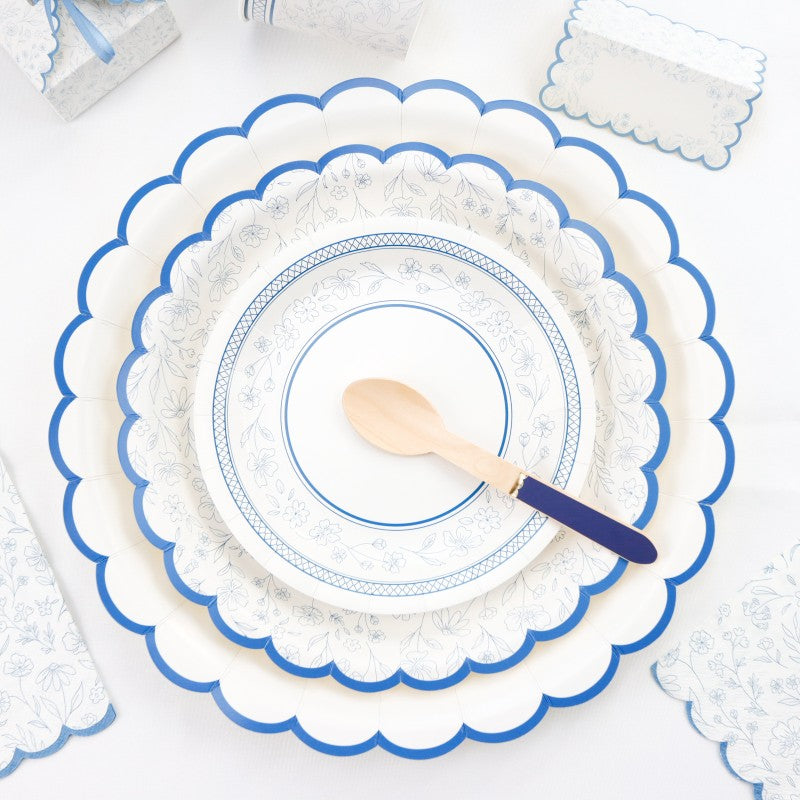 Elegant cardboard plate with a scalloped blue rim and matching flowers. A must-have for your christening or communion table.