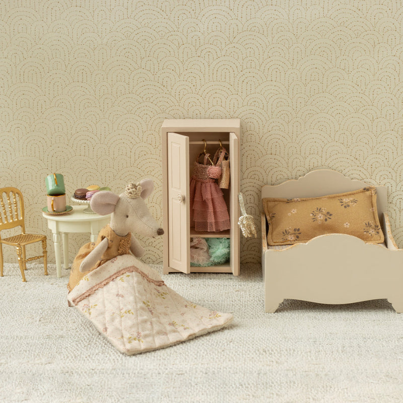 Una auténtica princesa ratón en tamaño de hermana mayor. Luce su mejor vestido con hermosos detalles y una corona dorada. Encaja a la perfección en el castillo de Maileg.