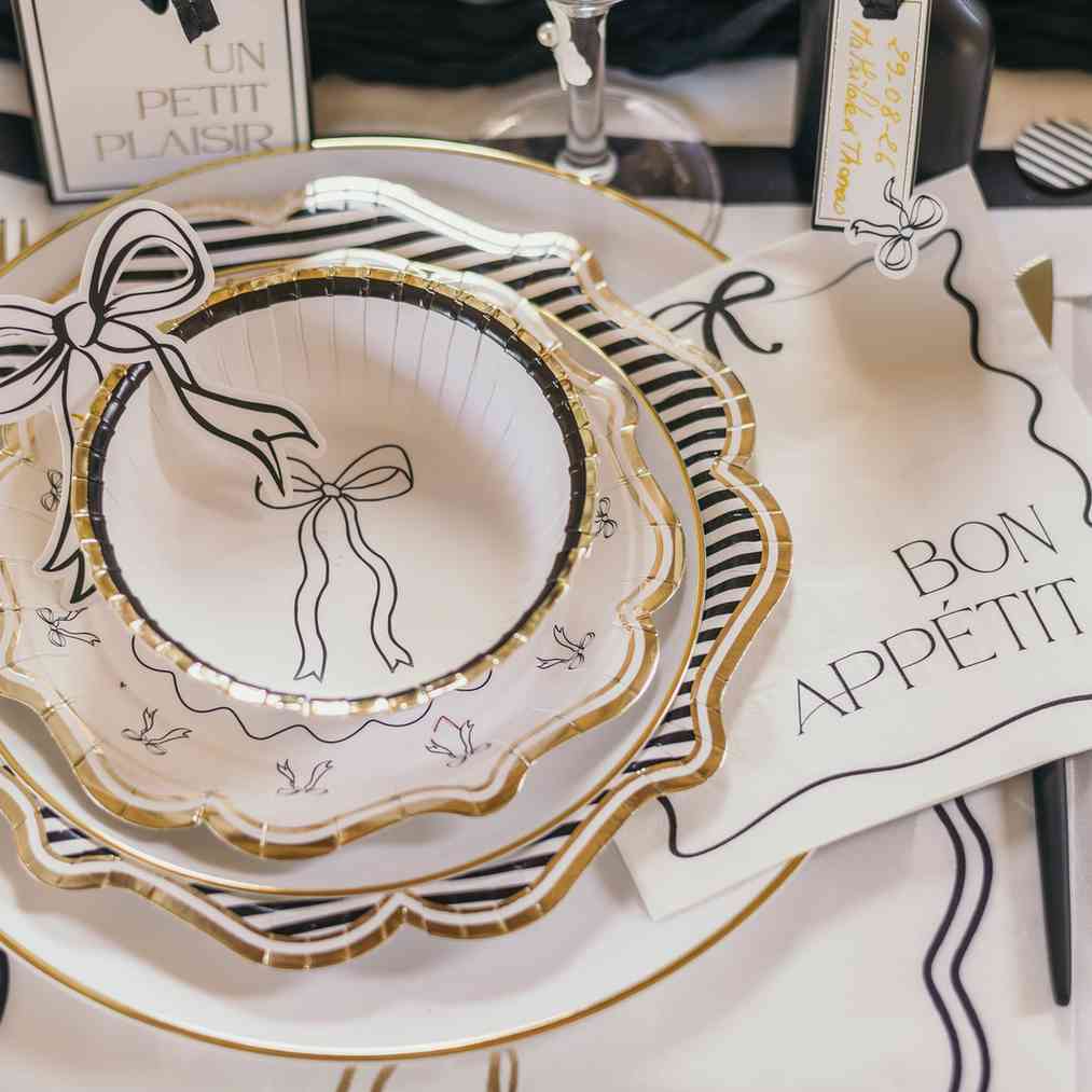 These napkins, with their clean lines and delicate finishes, will adorn your table with a chic and minimalist style that never goes out of fashion. The black and white contrast elegantly, and the small bow adds a touch of charm. Our napkins are FSC certified, making them both elegant and eco-friendly.