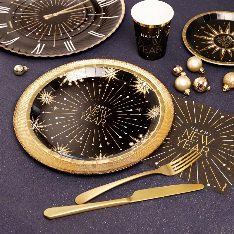 El último brindis, la última mesa del año... ¡y tu vas a brillar con tus vasos de la colección Happy New Year! Estos vasos de 270 cc van a ser la guinda del pastel para una mesa elegante en tonos negros y dorados, perfecta para dar la bienvenida al año.