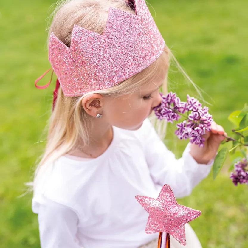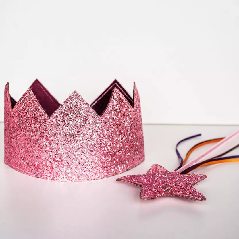 Corona de cumpleaños en acabado glitter rosa con varita de estrella a juego.
