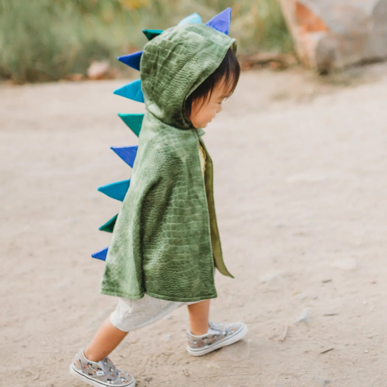 Bright green dragon cape with a scale effect and blue tips. Perfect for a carnival costume. It has a Velcro closure at the neck for extra support. Made with high-quality fabric to withstand a million adventures.