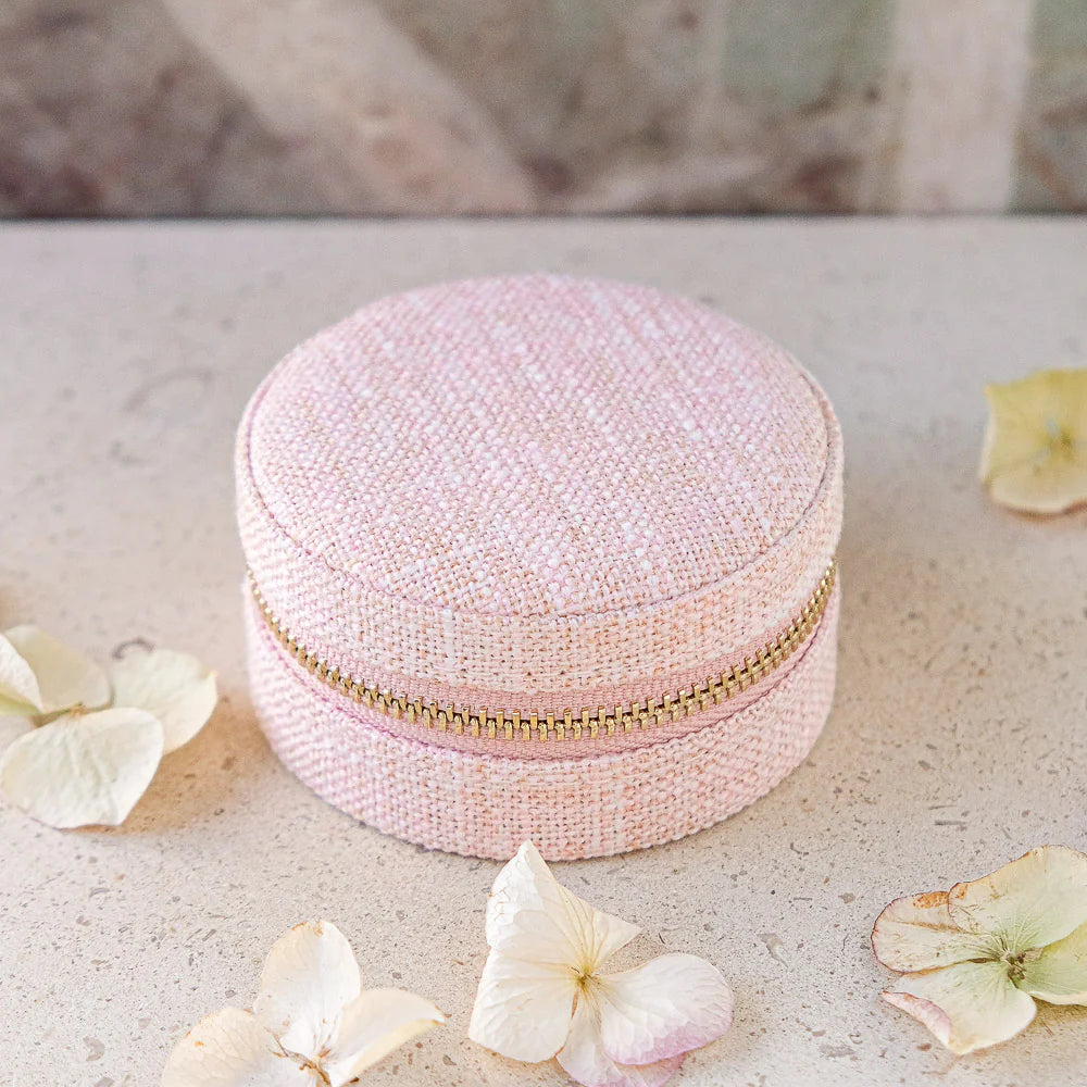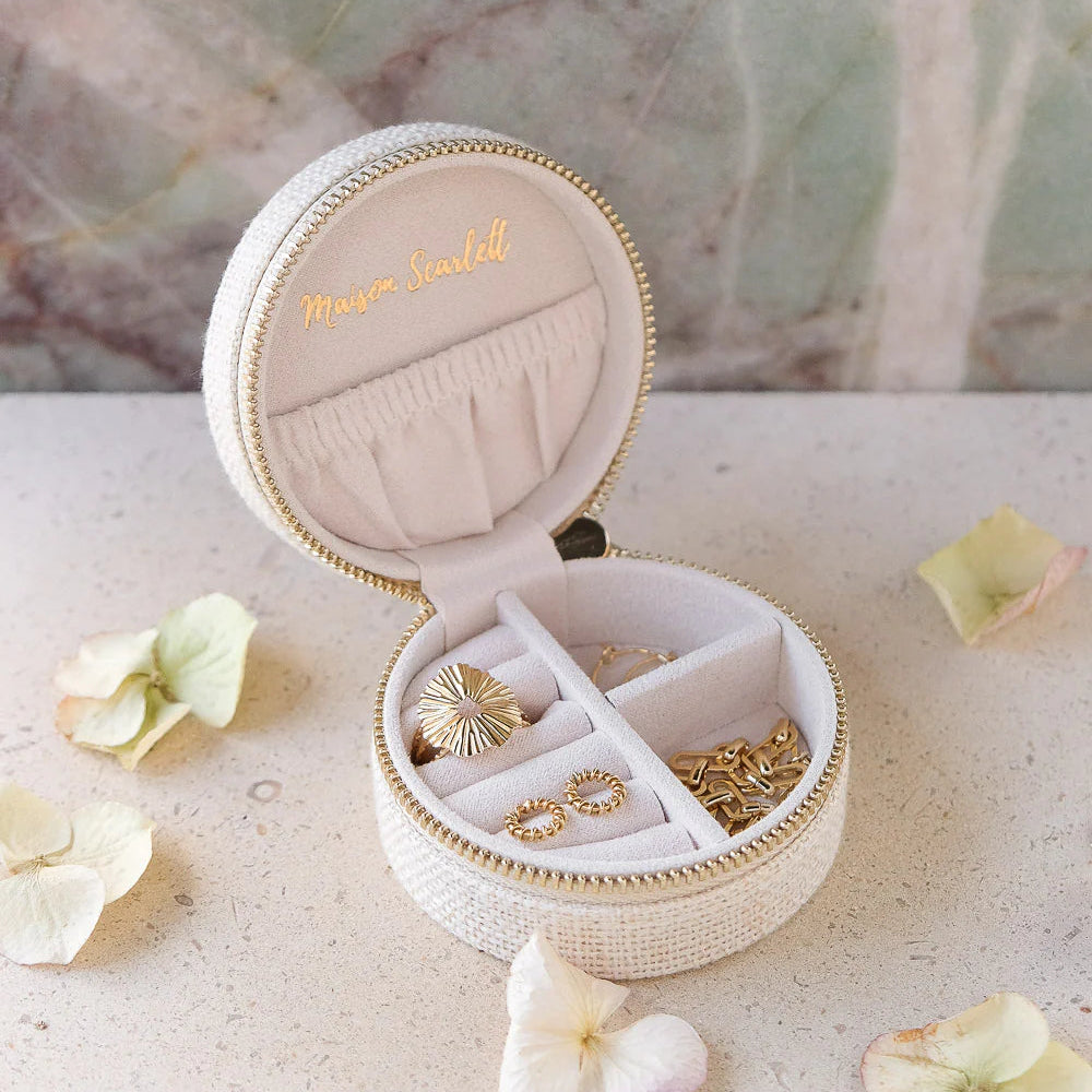 Yvone, es un elegante joyero mediano o de viaje de gran calidad. Es el regalo perfecto y su tamaño compacto lo hace fácil de llevar a todas partes. Su textura efecto lino y cremallera de acero dorado con el logo de Maison Scarlett grabado para mayor elegancia.