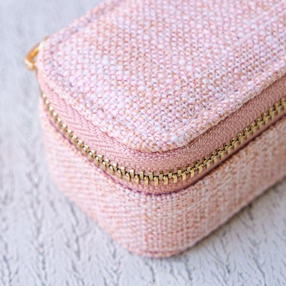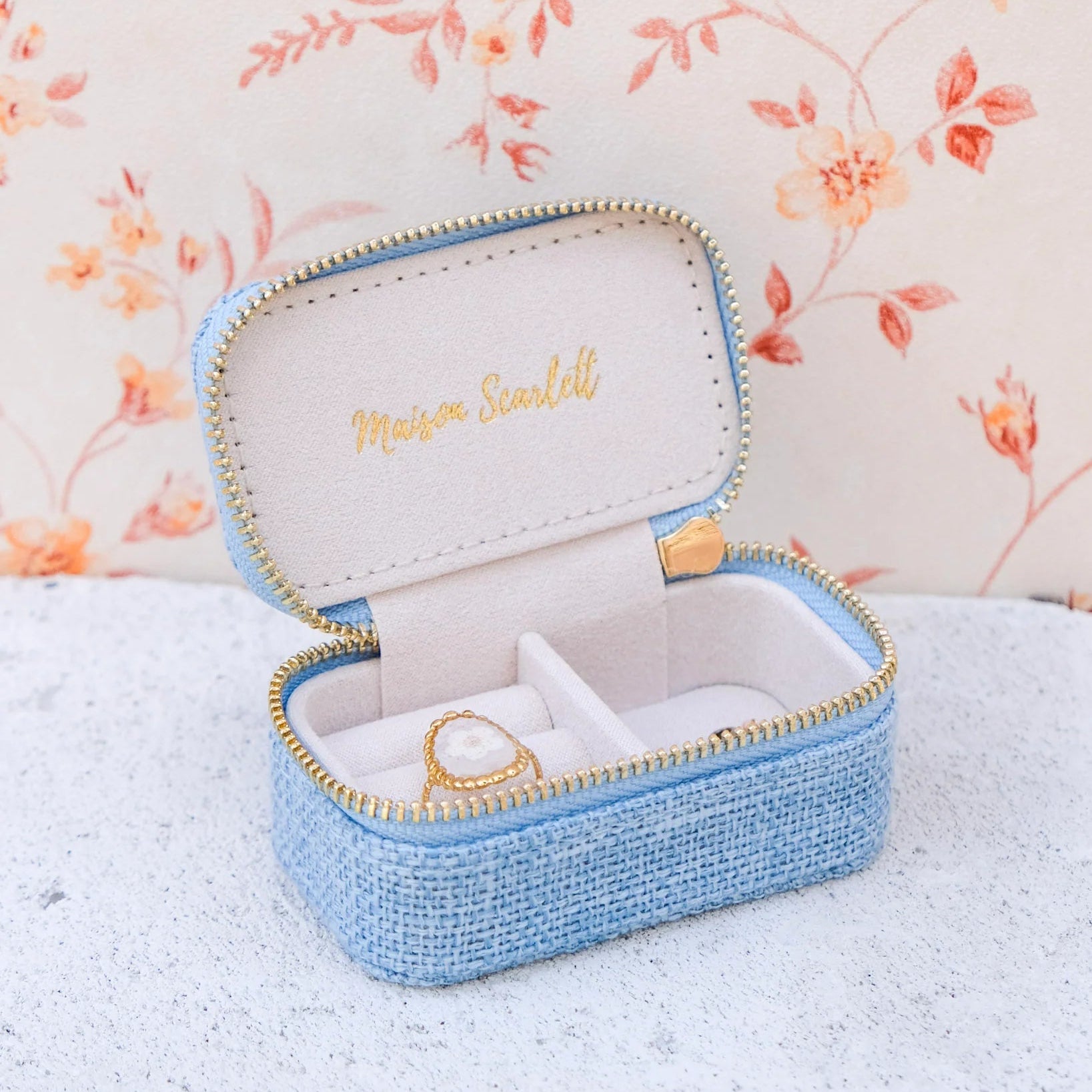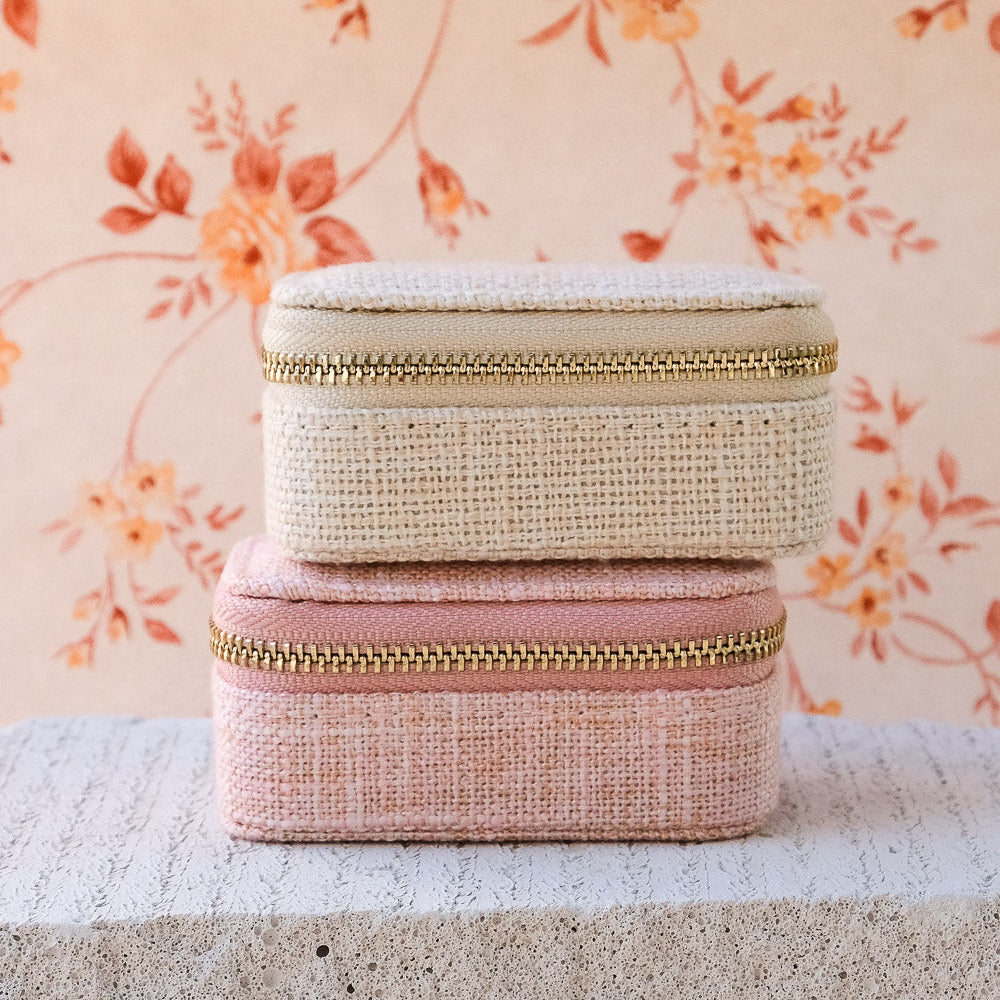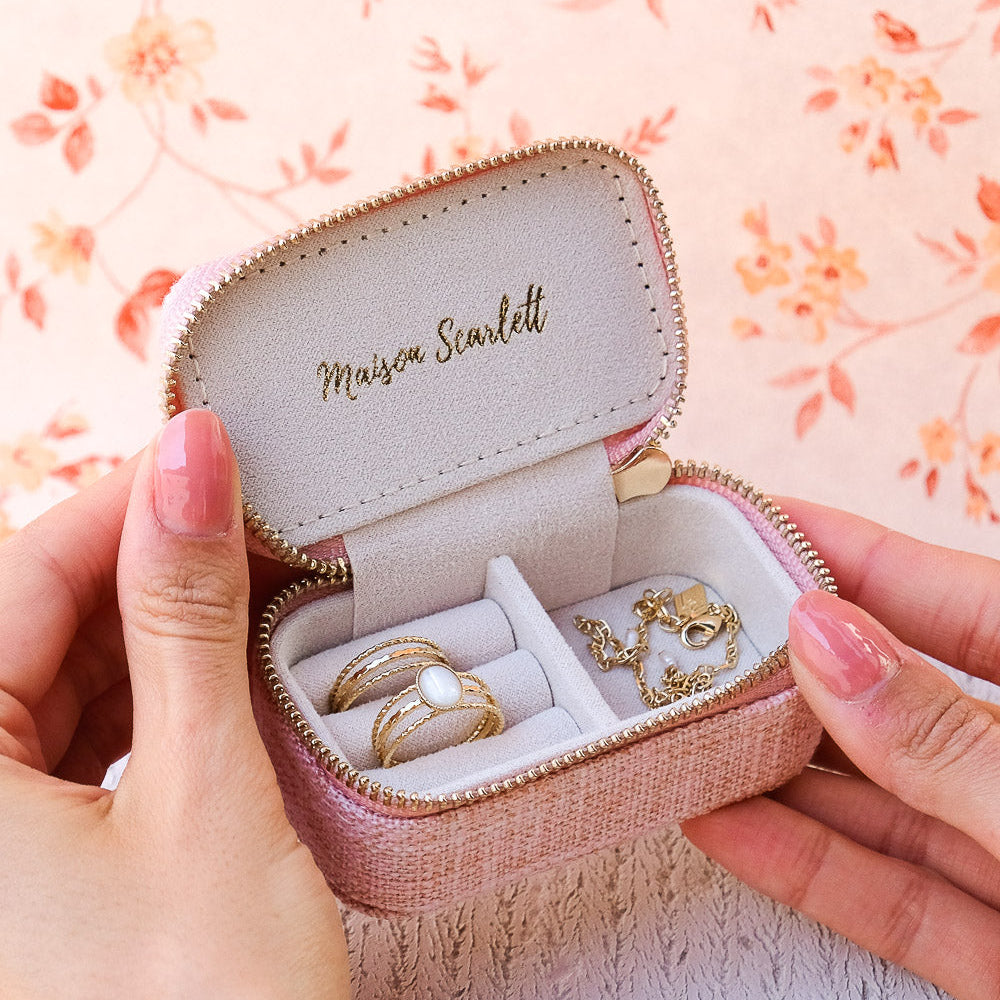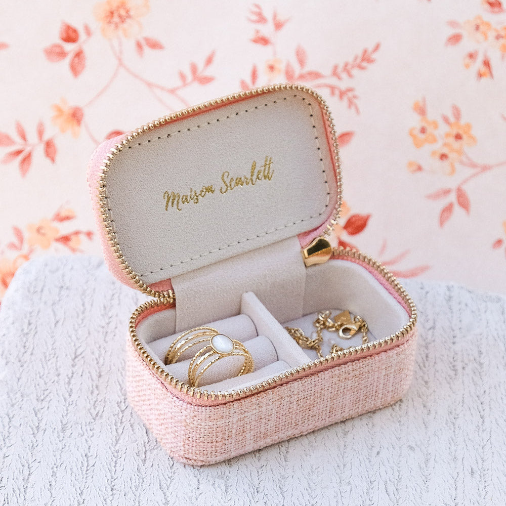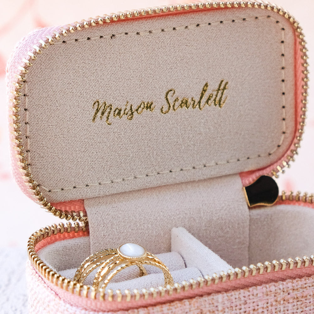 Marie, es un elegante joyero pequeño o de viaje de gran calidad. Es el regalo perfecto y su tamaño compacto lo hace fácil de llevar a todas partes. Su textura efecto lino y cremallera de acero dorado con el logo de Maison Scarlett grabado para mayor elegancia.