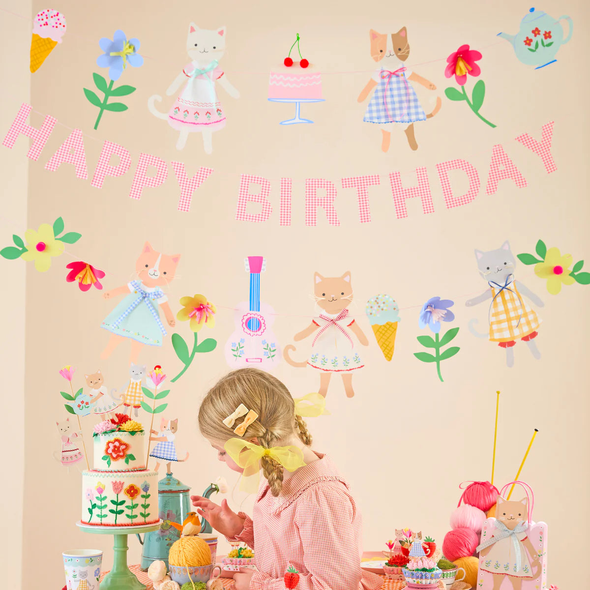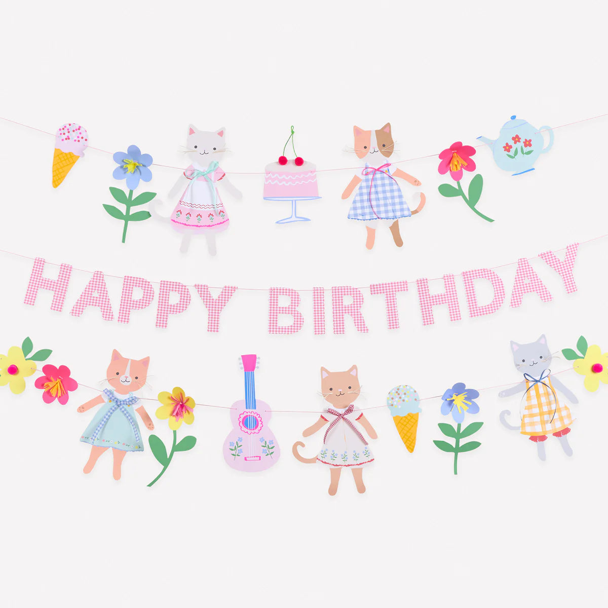 Let yourself be enchanted by the charm of folk-inspired decor with our Kitten Club garland set. It includes three beautifully crafted paper garlands, perfect for displaying together for a stunning effect, or separately to decorate the party room. Two of them feature a parade of adorable kittens with twine whiskers, dressed in charming folk-inspired outfits adorned with bows, 3D embellished flowers, and many other fun motifs. The pink garland with the "Happy Birthday" phrase is a stylish way to celebrate a special day. Full of color and personality, they will make any birthday unforgettable. Use them year after year for instant cheer.