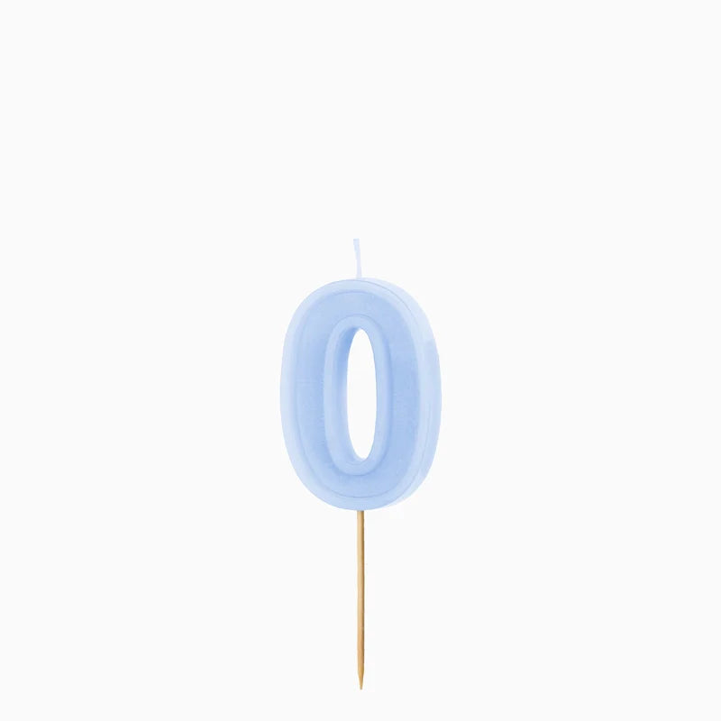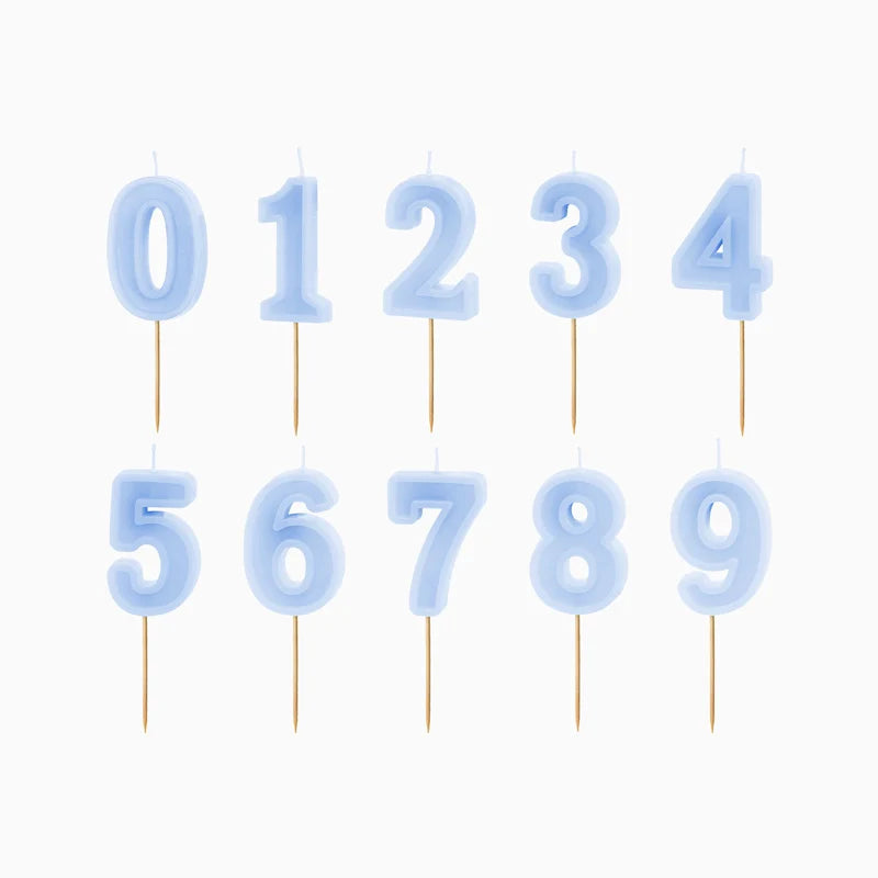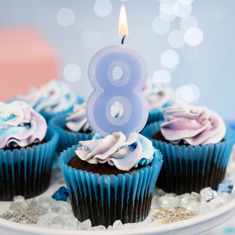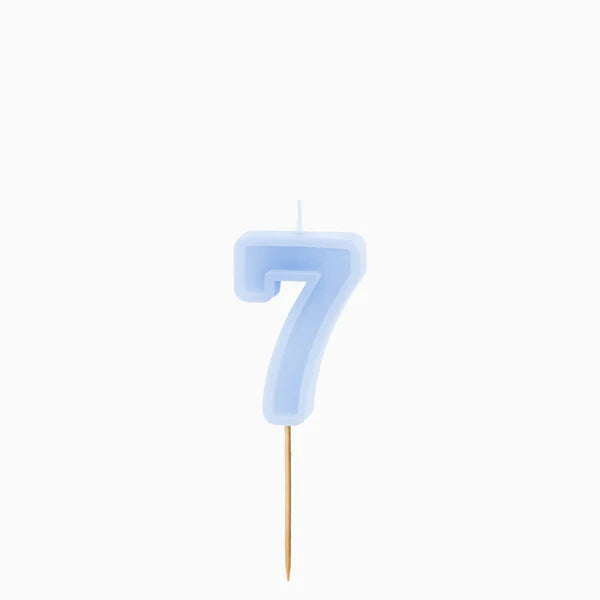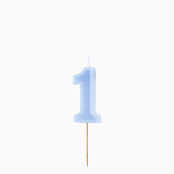 Vela de número en color azul pastel con borde, un básico para un bonito pastel de cumpleaños.