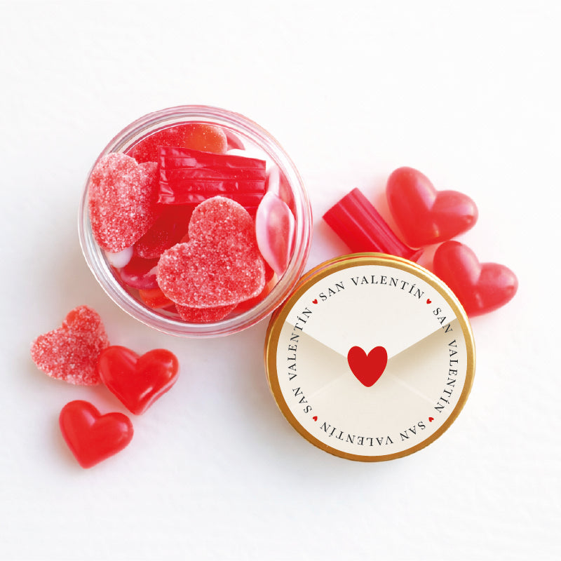 Cada bote de plástico grueso tiene una tapa de aluminio dorado con etiqueta en forma de carta de amor rellenos de golosina de la mejor calidad fabricadas en España.