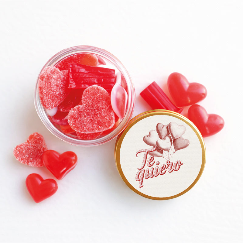 Cada bote de plástico grueso tiene una tapa de aluminio dorado con etiqueta "Te quiero" rellenos de golosina de la mejor calidad fabricadas en España.