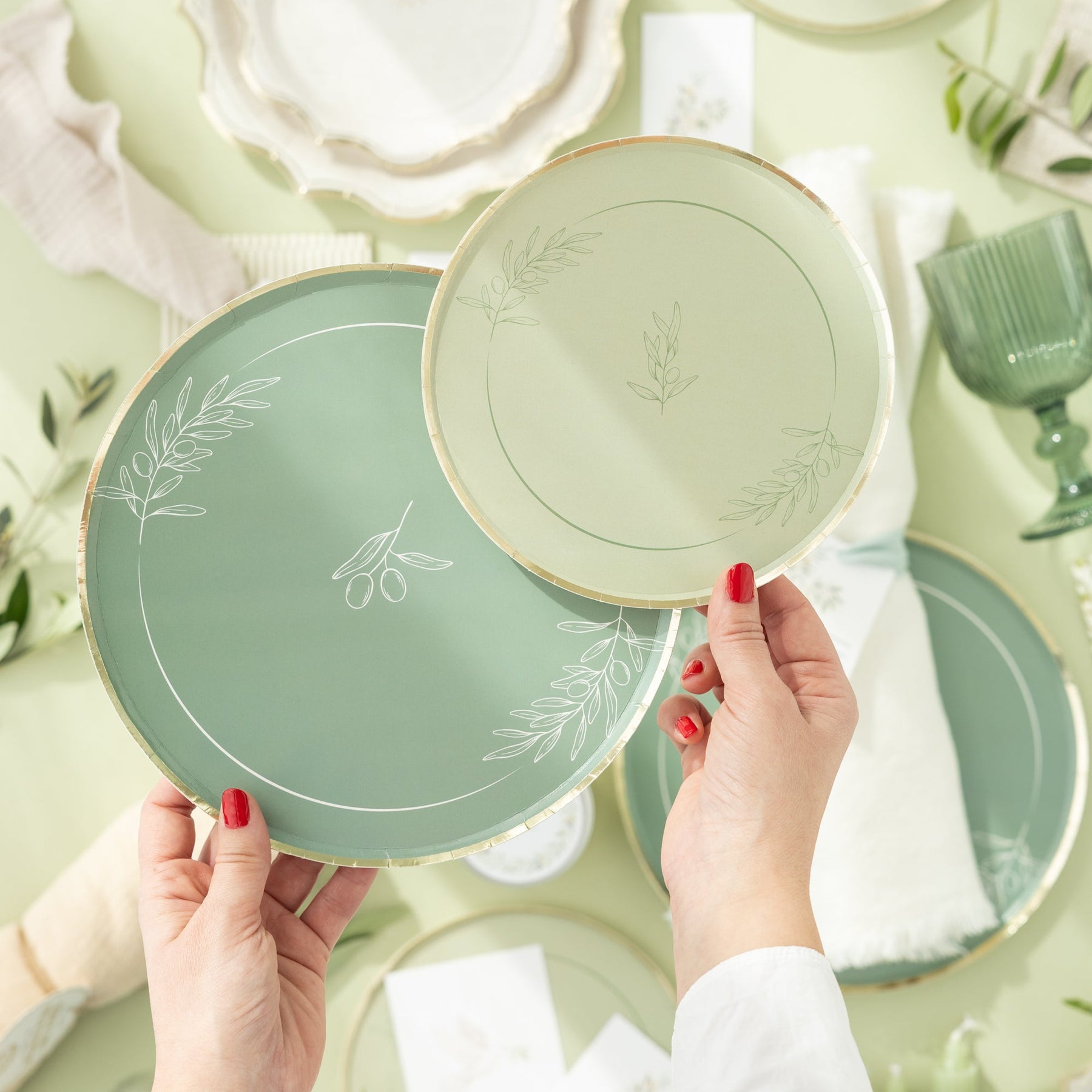 Elegante plato de cartón tamaño fondo con vivo dorado de la colección Olivo.