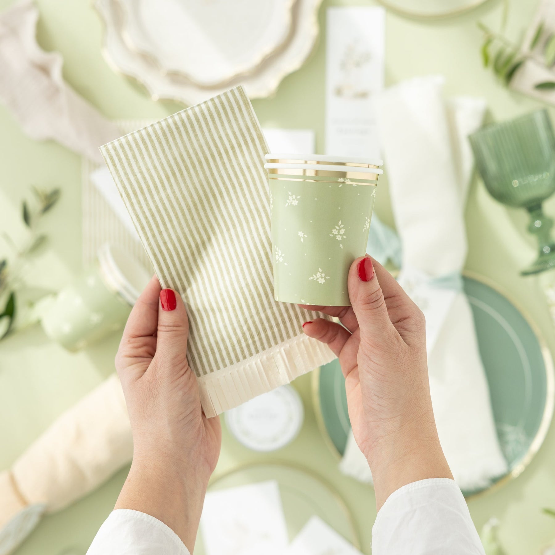 Servilletas de papel con flecos rayitas marfil y verde olivo perfectos para el primer cumpleaños de tu bebé, Comunión o Bautizo.