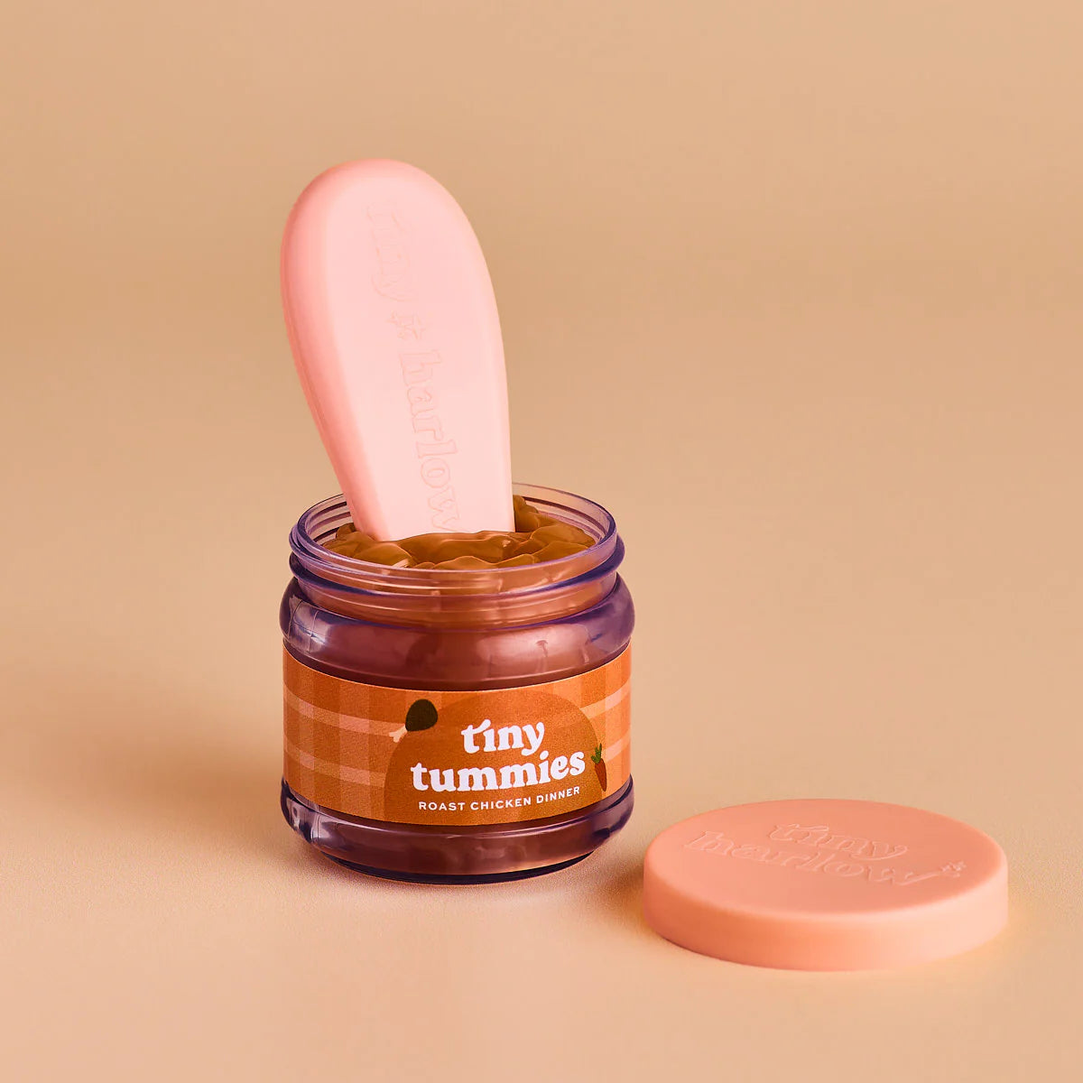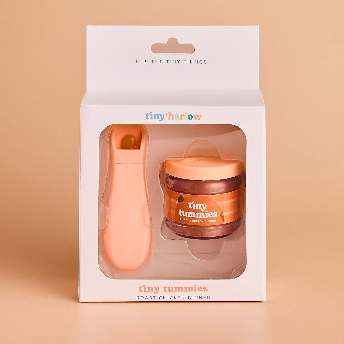 Este set se presenta en un bonito packaging individual y forma parte de la colección Tiny Tummies, disponible en distintos sabores: Coconut Yoghurt, Grape Jelly, Roast Chicken Dinner, Apple Purée, Banana Custard, Chocolate Custard, Strawberry Custard y Peach Jelly.
