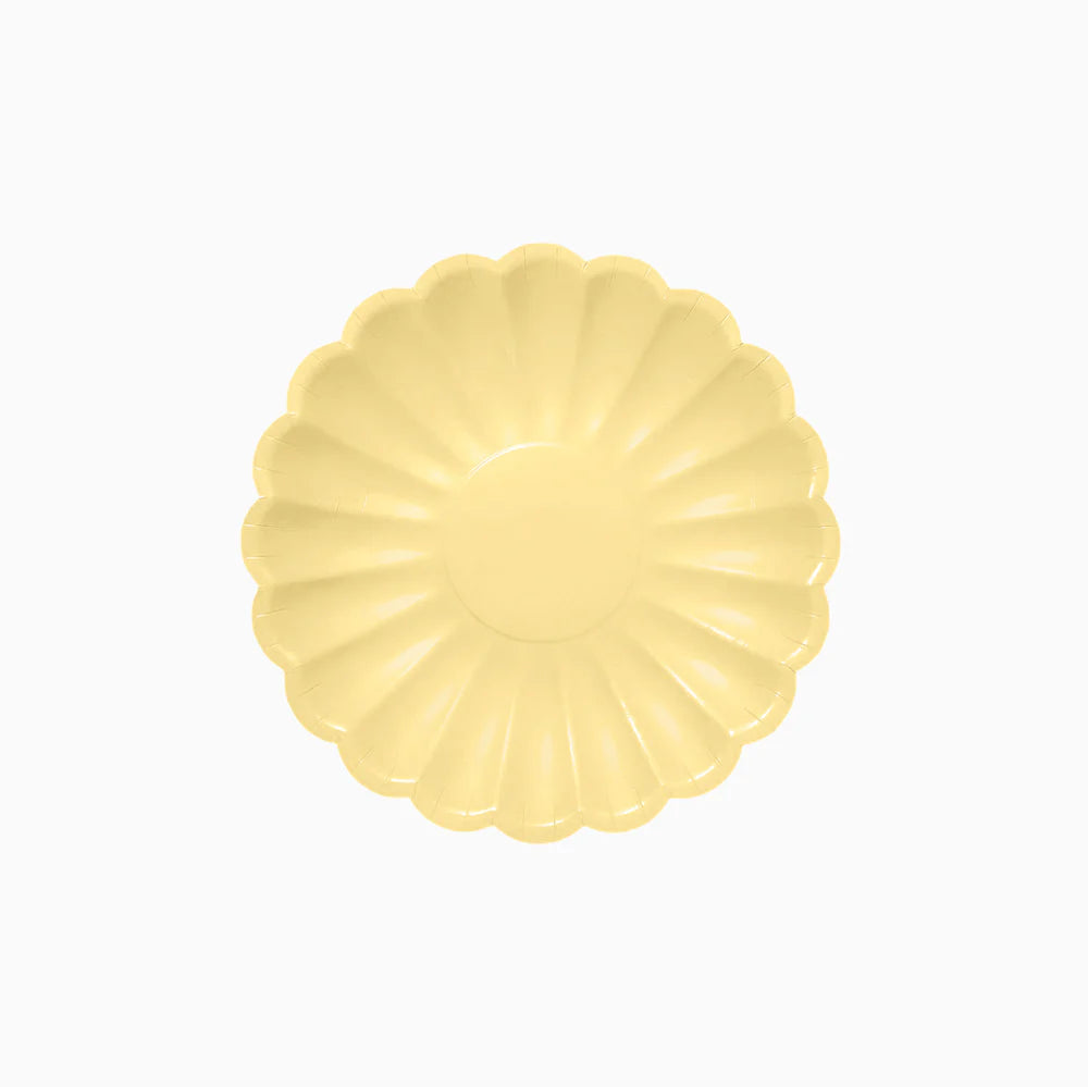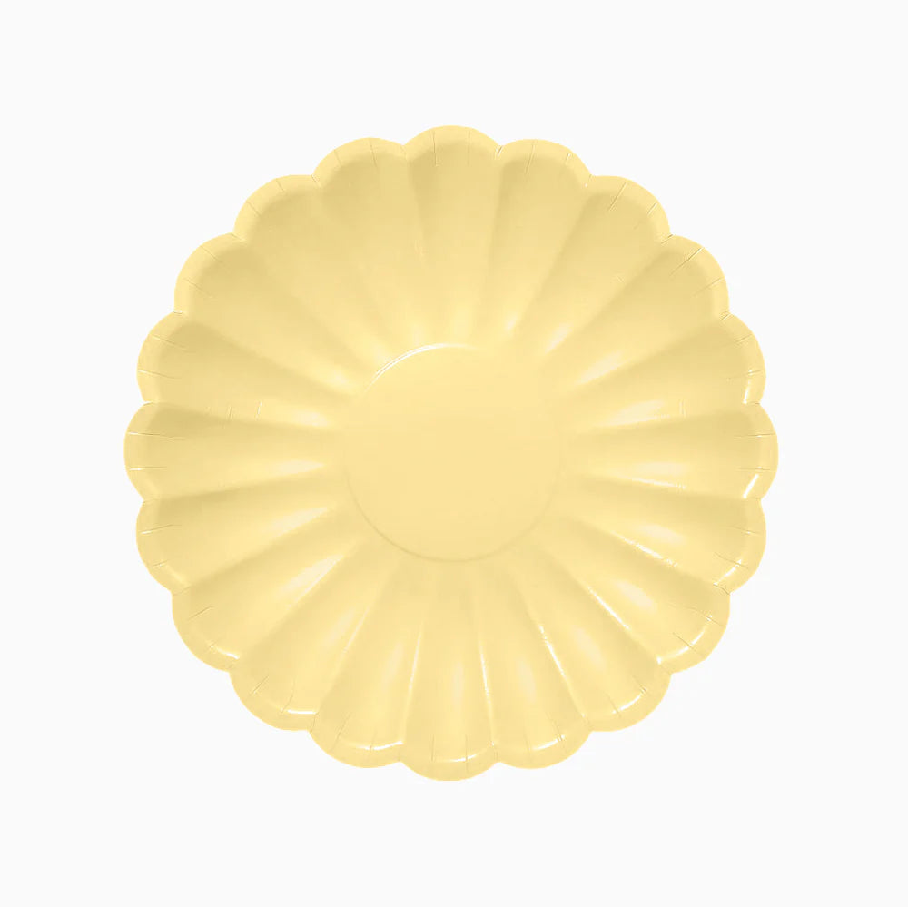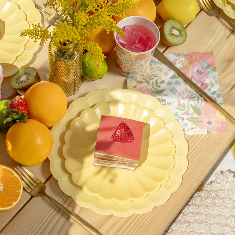 Estos platos de cartón en amarillo claro con borde festonado son un básico imprescindible en tu mesa de fiesta. Su color y forma los hace muy elegantes y fácil de combinar para cualquier temática.