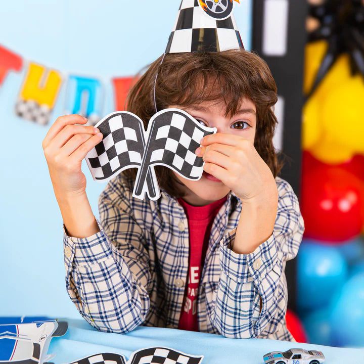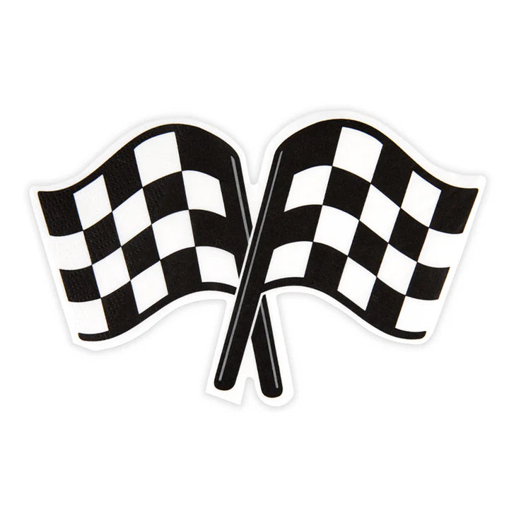 Servilletas de papel con forma de bandera de carreras en cuadros blancos y negros.