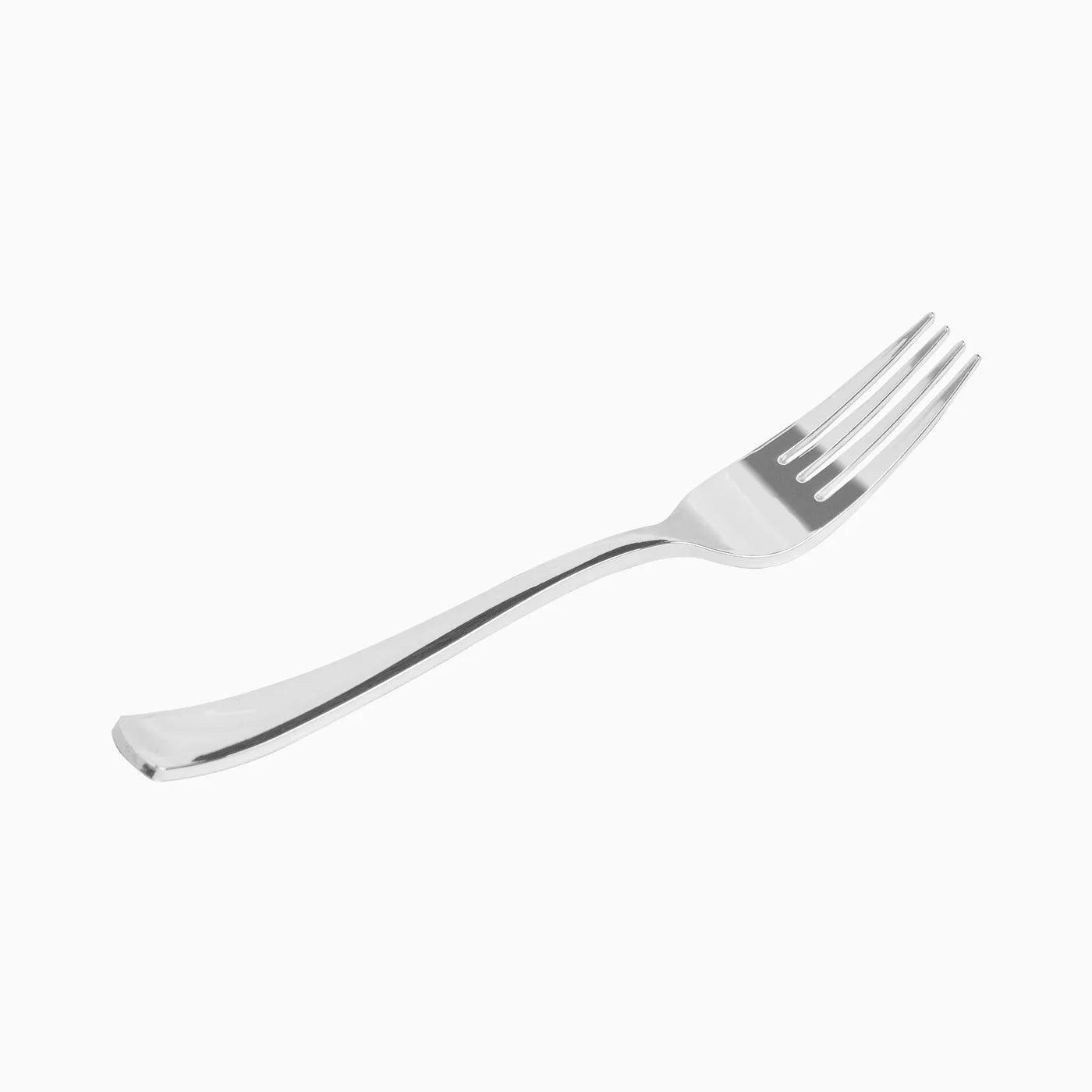 Tenedores de 18,5 cm de plástico reutilizable en color plata. Con acabado de brillo, gracias a su mayor calidad son más rígidas, elegantes y resistentes.
