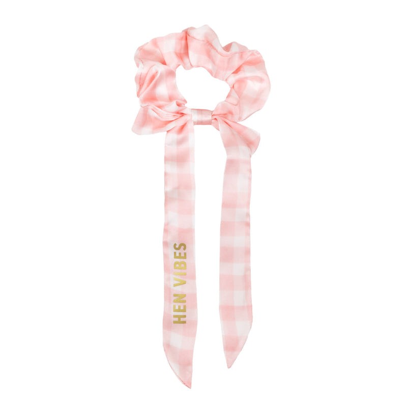Quando se organiza uma despedida de solteira, são os pequenos detalhes que fazem toda a diferença. Estes elásticos para o cabelo, que podem ser usados e guardados como recordação, tornarão a celebração inesquecível para a futura noiva. Feitos em tecido xadrez rosa pastel e branco, e estampados com a frase "HEN VIBES".