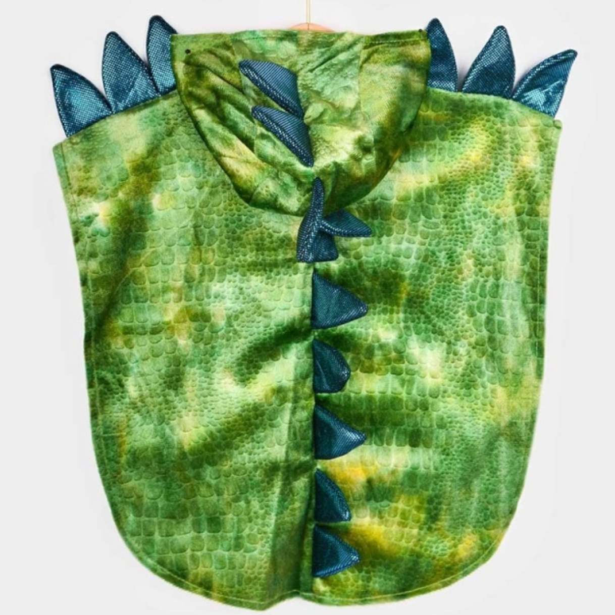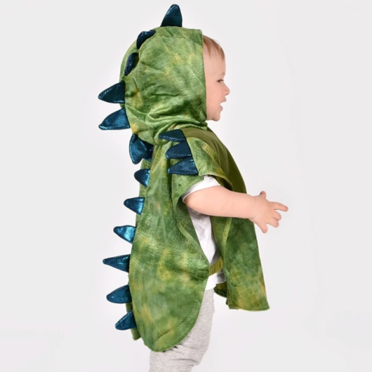 Este disfraz de dinosaurio verde no puede ser más ideal. Se cierra con velcro por la parte delantera, incluye capucha cosida y cuernos acolchados en color azul metalizado en la parte superior de la capucha. Tiene una larga cola con púas acolchadas a juego que llega hasta el suelo. En ambos laterales tiene una banda elástica.