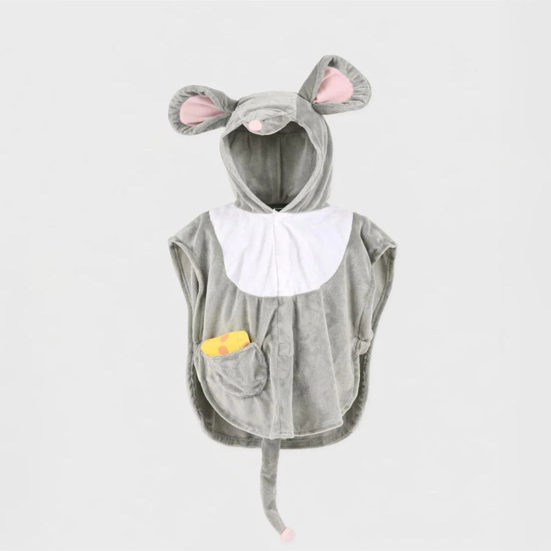 Este disfraz de ratón no puede ser más ideal. Se cierra con velcro por la parte delantera, incluye cola en la espalda y un divertido queso en el bolsillo derecho. Incluye elásticos en los laterales.