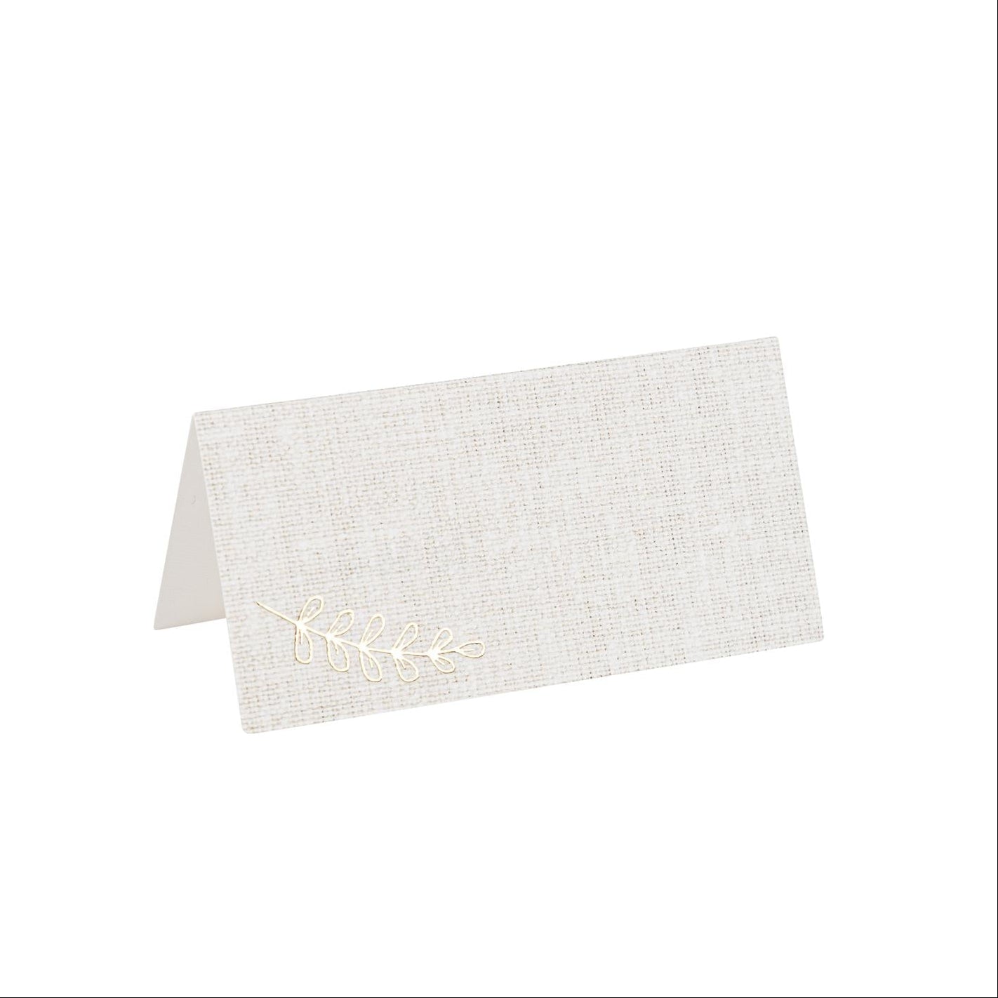 Marcadores de lugar em cartão com acabamento em efeito linho e detalhe de folha dourada. Perfeitos para identificar pratos ou lugares à mesa. Muito elegantes e discretos.