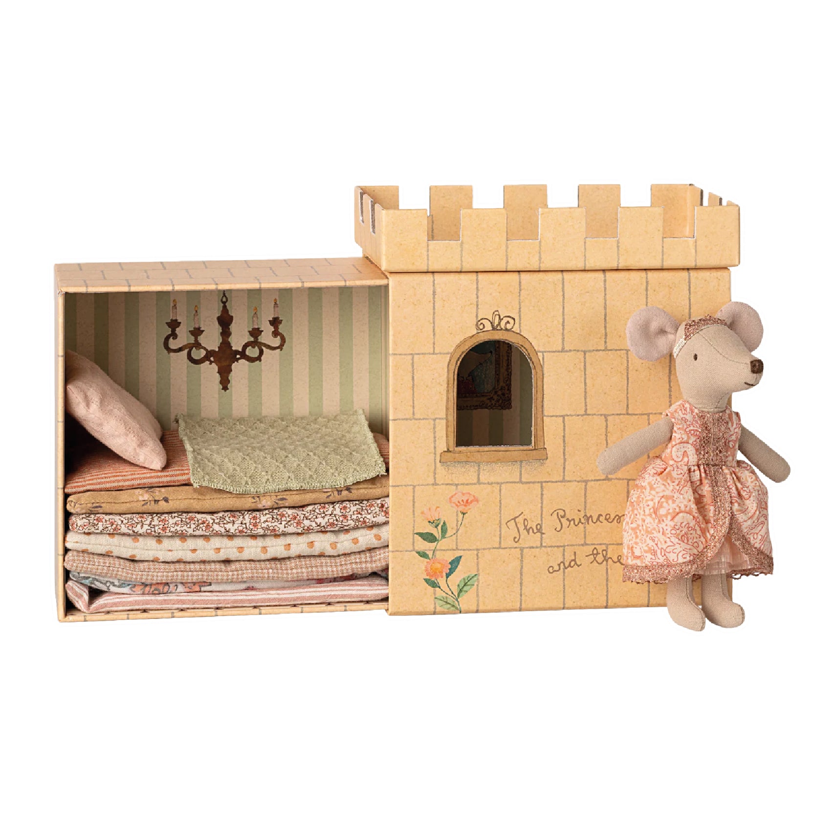 Uma linda ratinha da história infantil "A Princesa e a Ervilha", costurada à mão em algodão com detalhes requintados aplicados manualmente. Dorme dentro do seu castelo, empoleirada em pequenos colchões de tecido onde esconde uma grande ervilha.