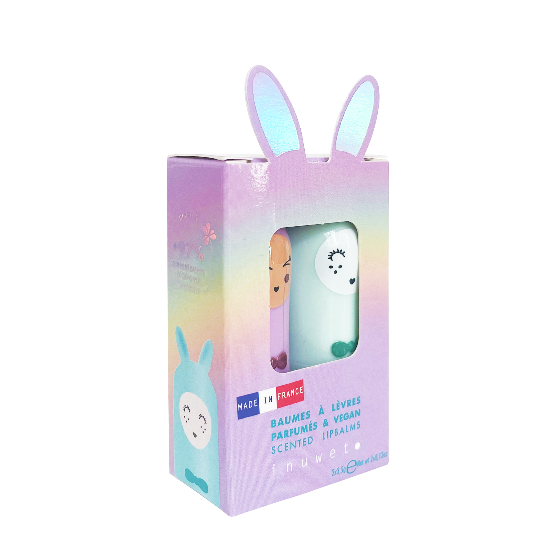 Caixa de presente com dois bálsamos labiais veganos feitos com ingredientes naturais. Este duo com silhueta de coelhos é suavemente perfumado e enriquecido com manteiga de karité e óleo de macadâmia que nutrirão, repararão e protegerão os lábios.