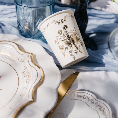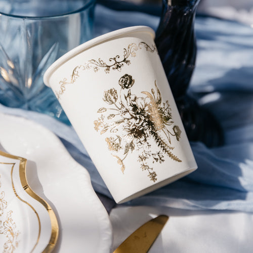 Adicione um toque de elegância clássica às suas celebrações com os nossos Copos Dourados Vintage. Este conjunto de 8 copos é a escolha perfeita para quem aprecia um design sofisticado e intemporal. Cada copo é decorado com um delicado estampado floral num elegante tom dourado, sobre um fundo branco puro. A borda superior ostenta também um subtil motivo dourado que realça a sua sofisticação. Ideais para casamentos, aniversários ou qualquer evento especial, estes copos transformarão a sua mesa numa decoração de bom gosto. Desfrute dos seus momentos especiais com um toque de distinção vintage.